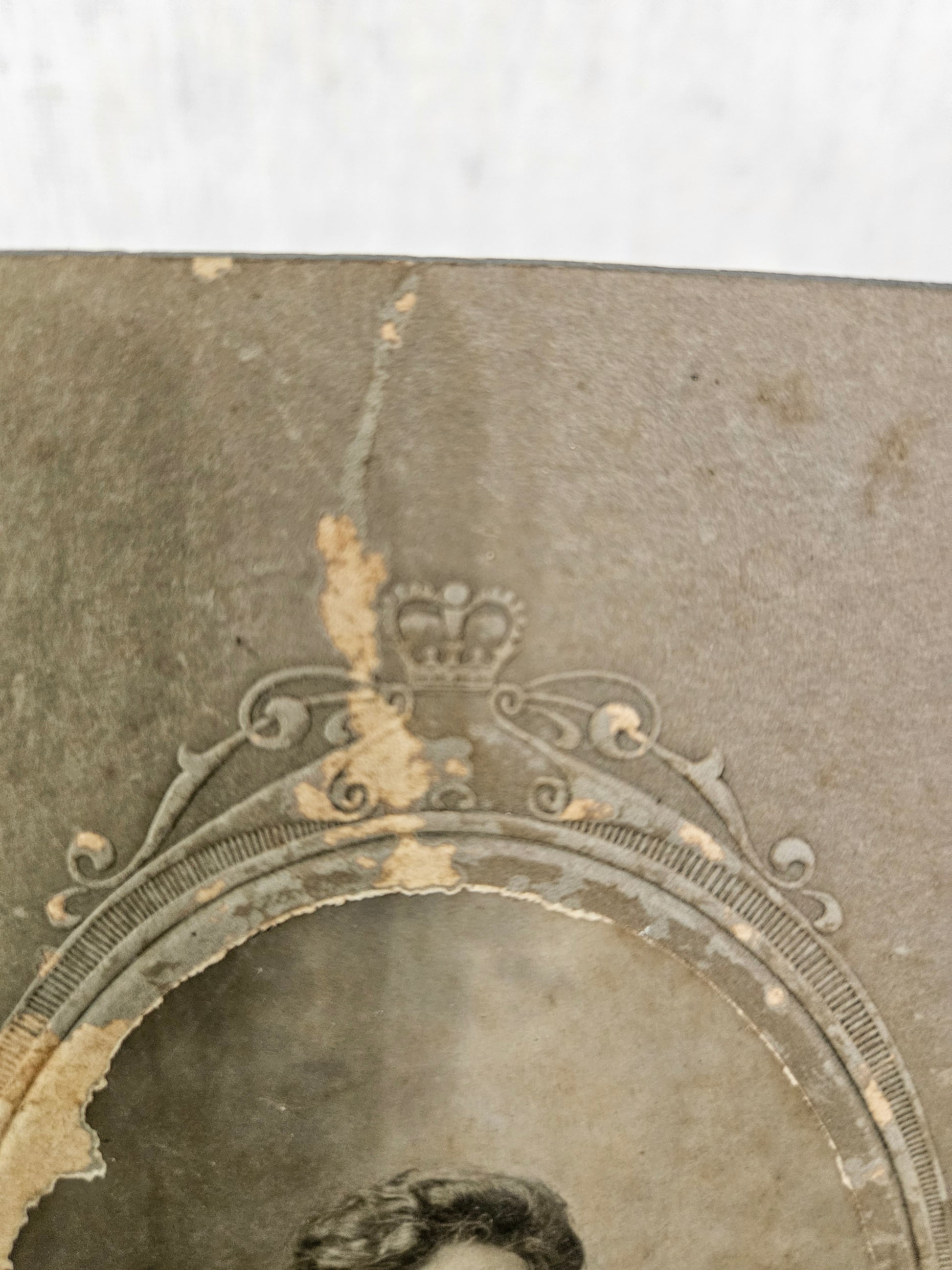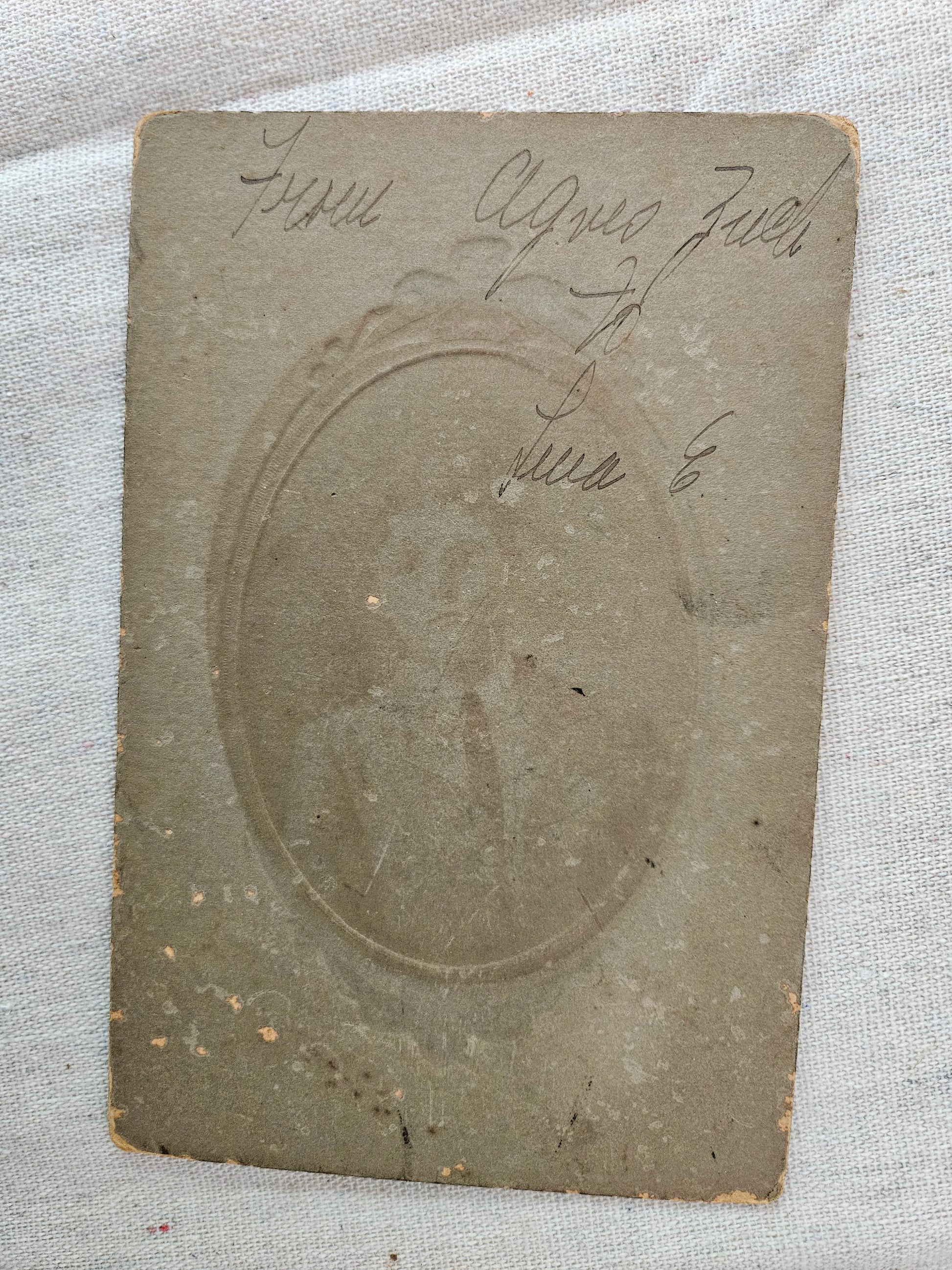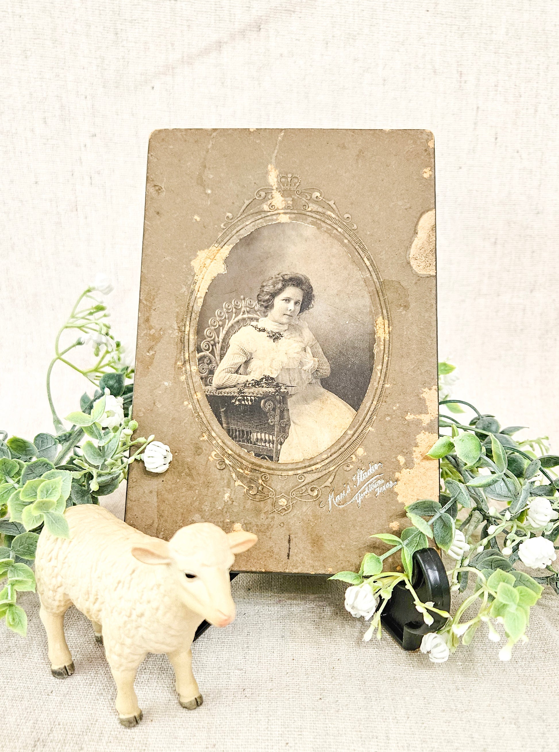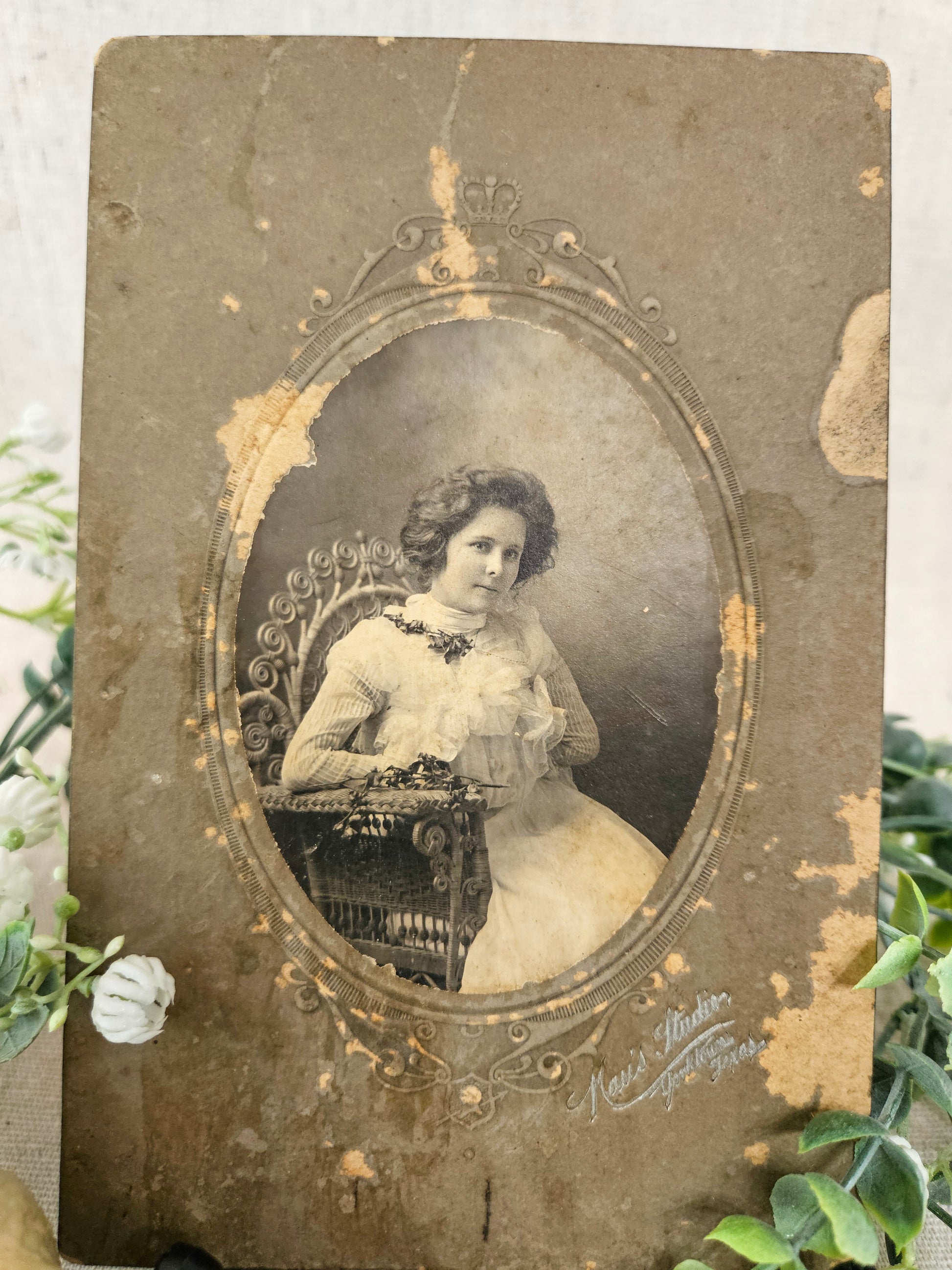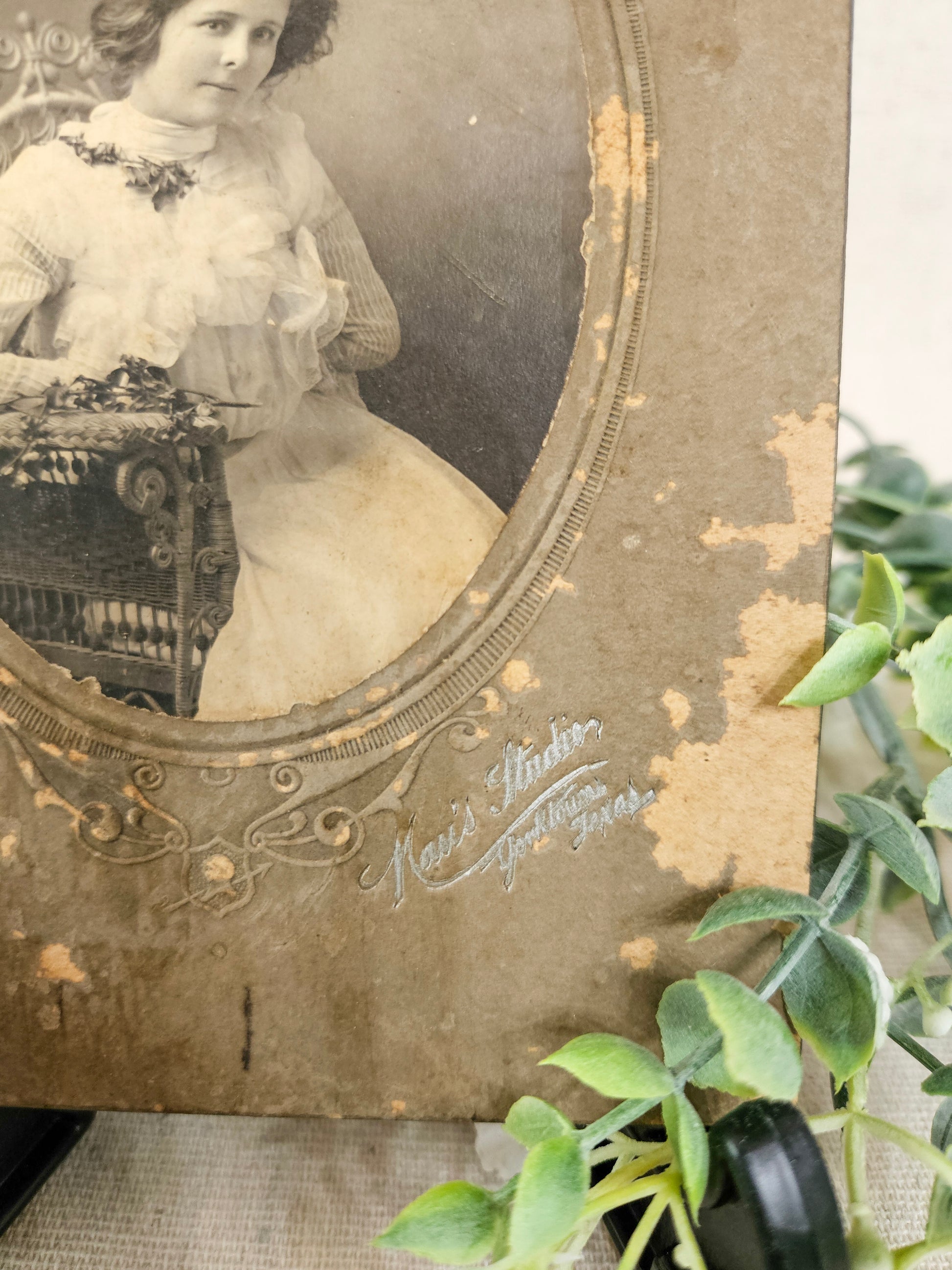 The photo is an early 20th century photo of a well dressed woman sitting in an ornate rattan chair. She has two stem of dried flowers near or on her. It is unclear if her left arm id tucked behind her back or under the abundant lace of her dress.