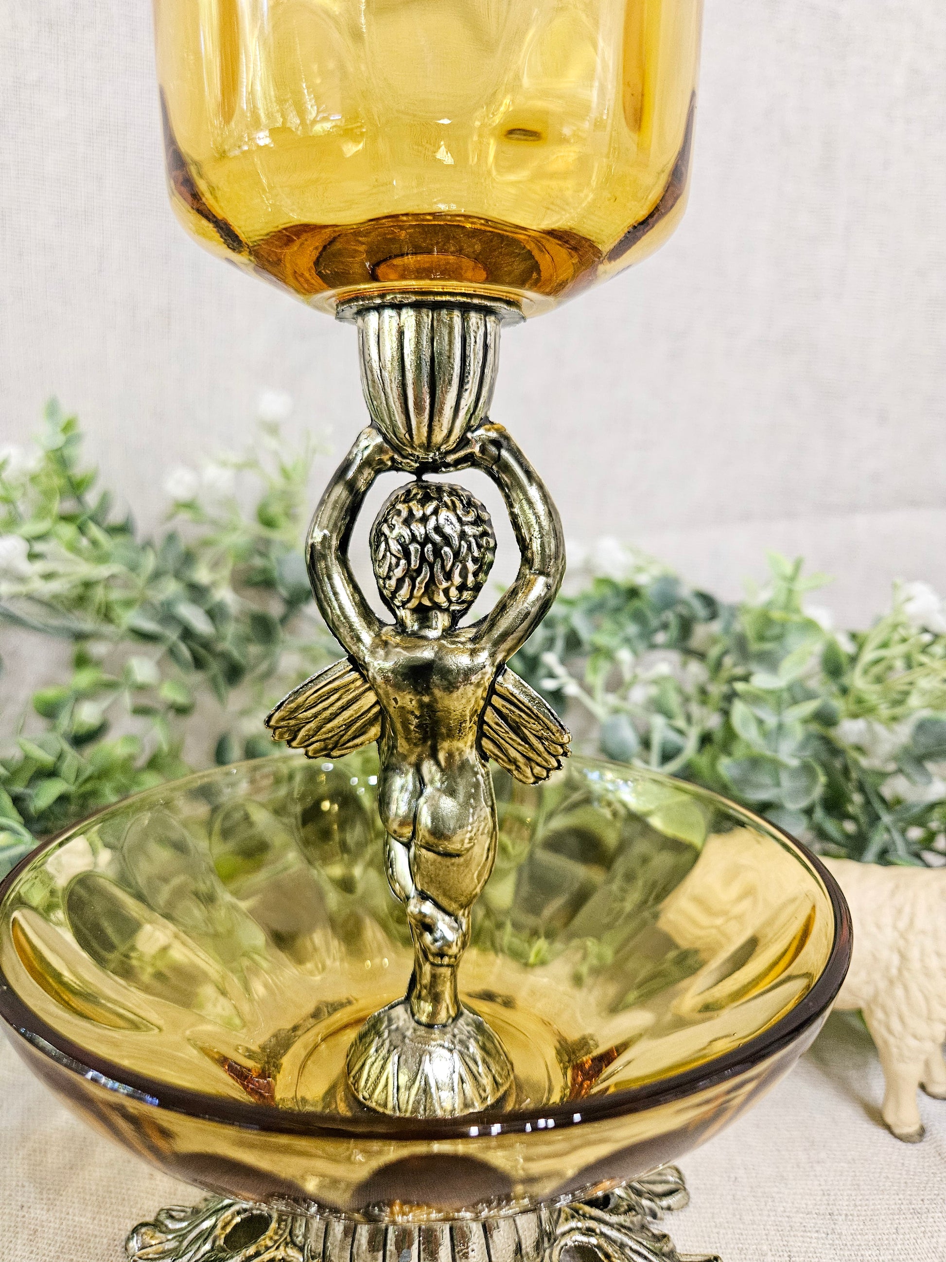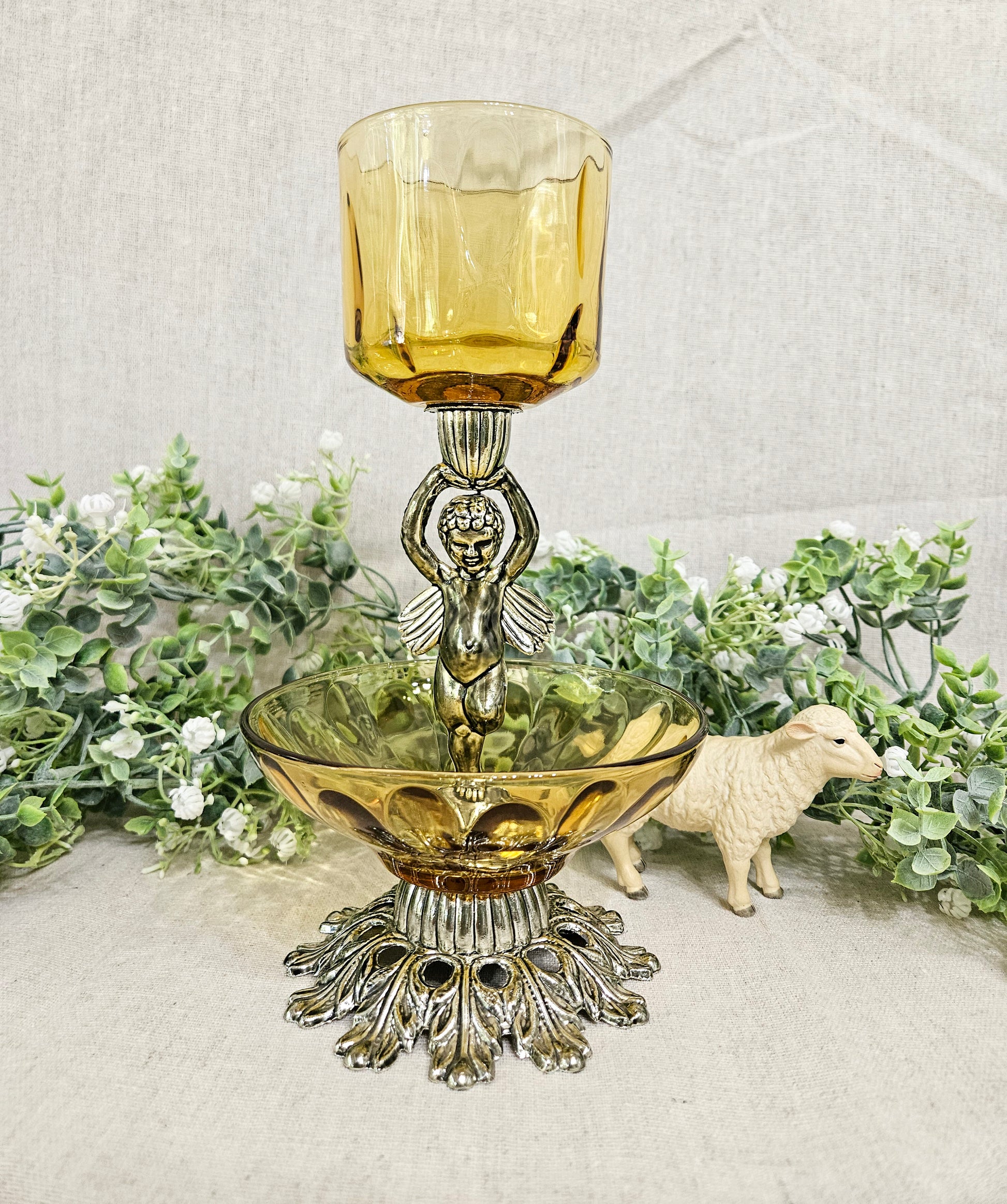 1970's Hollywood Regency Cherub Angel Candle Holder Amber Glass
