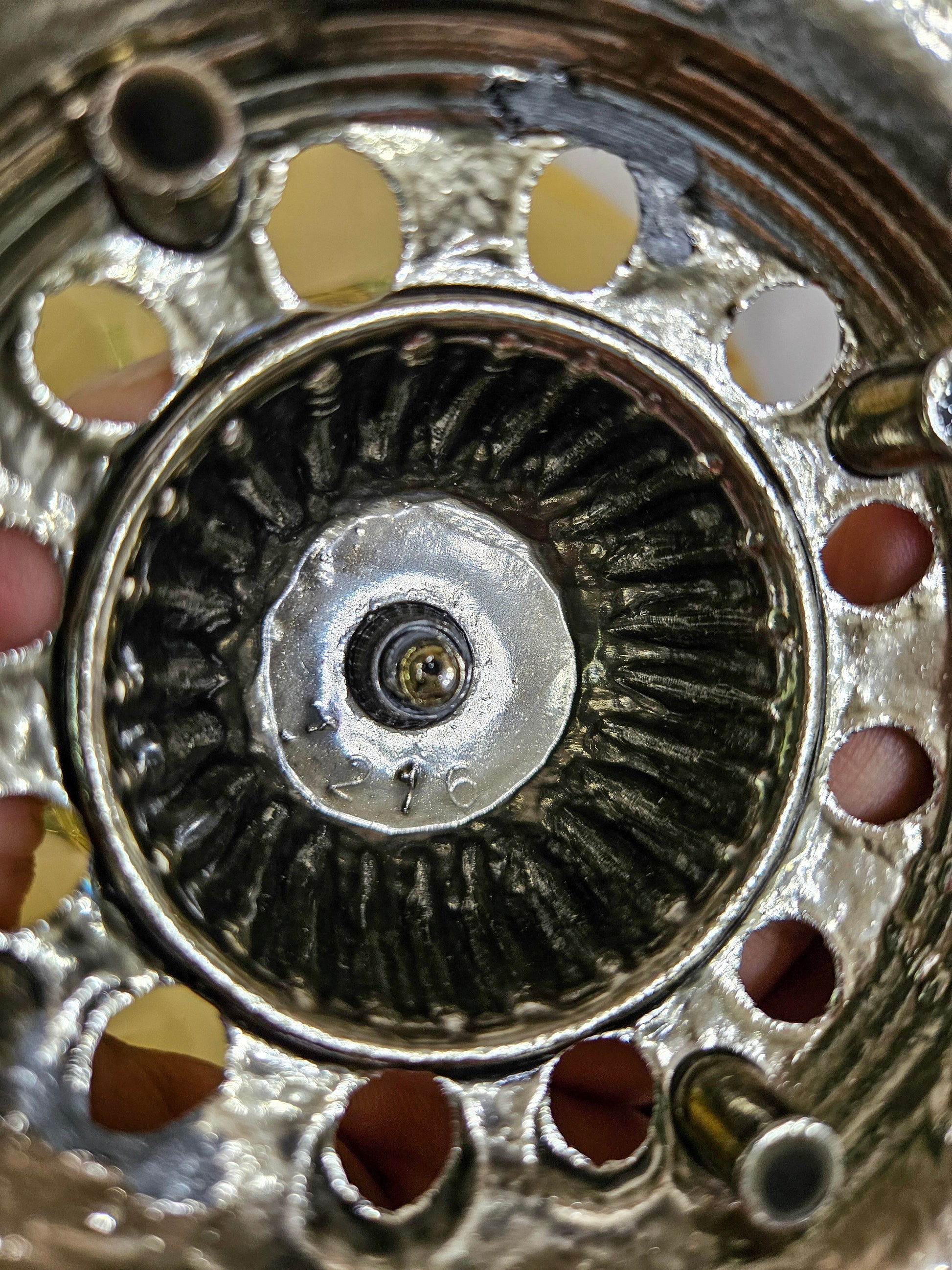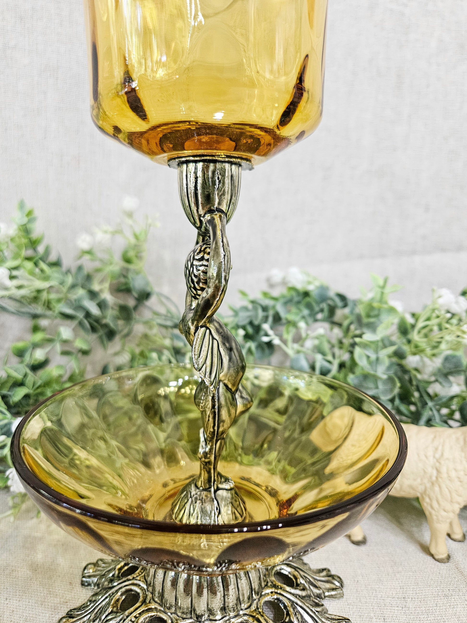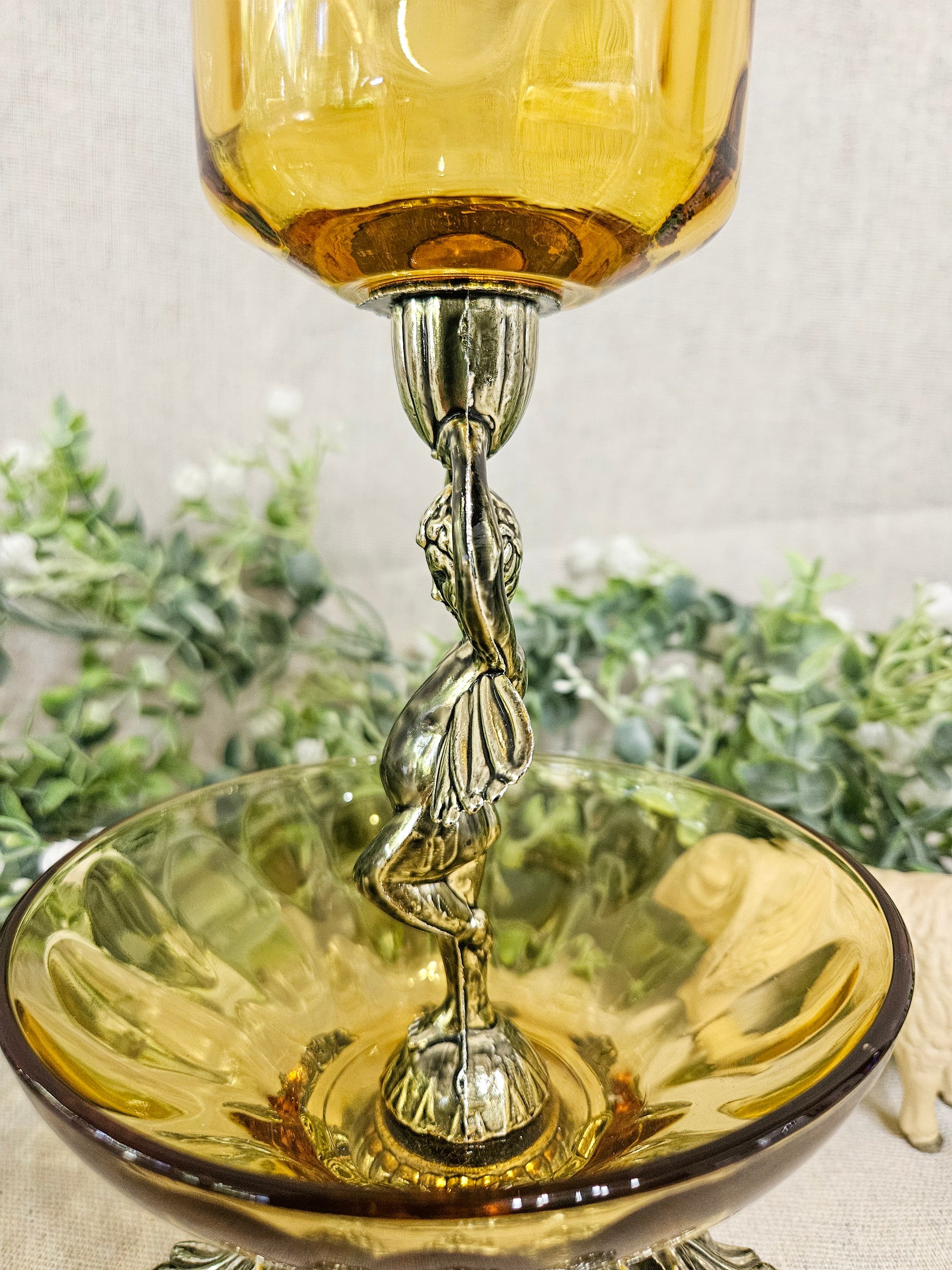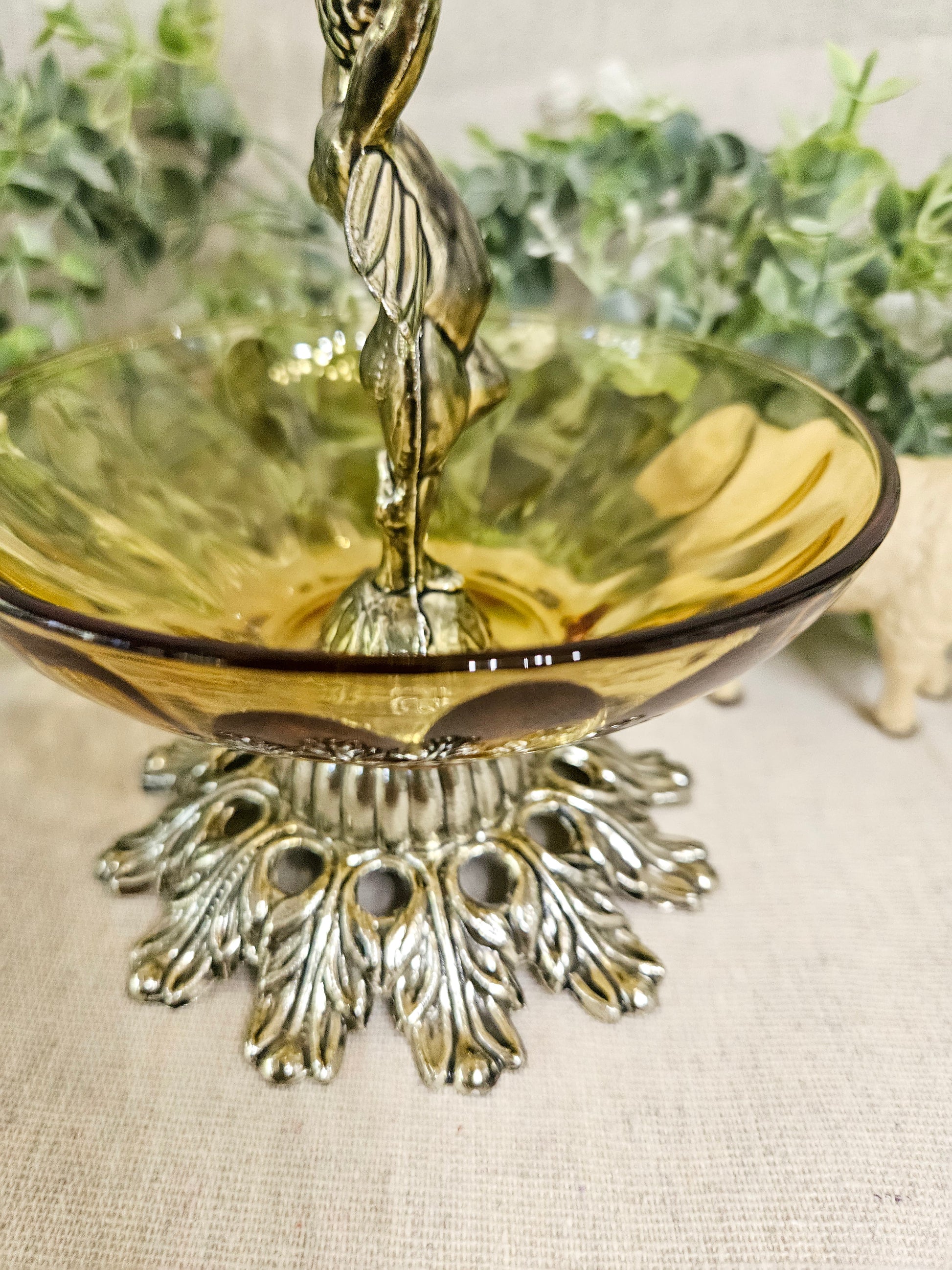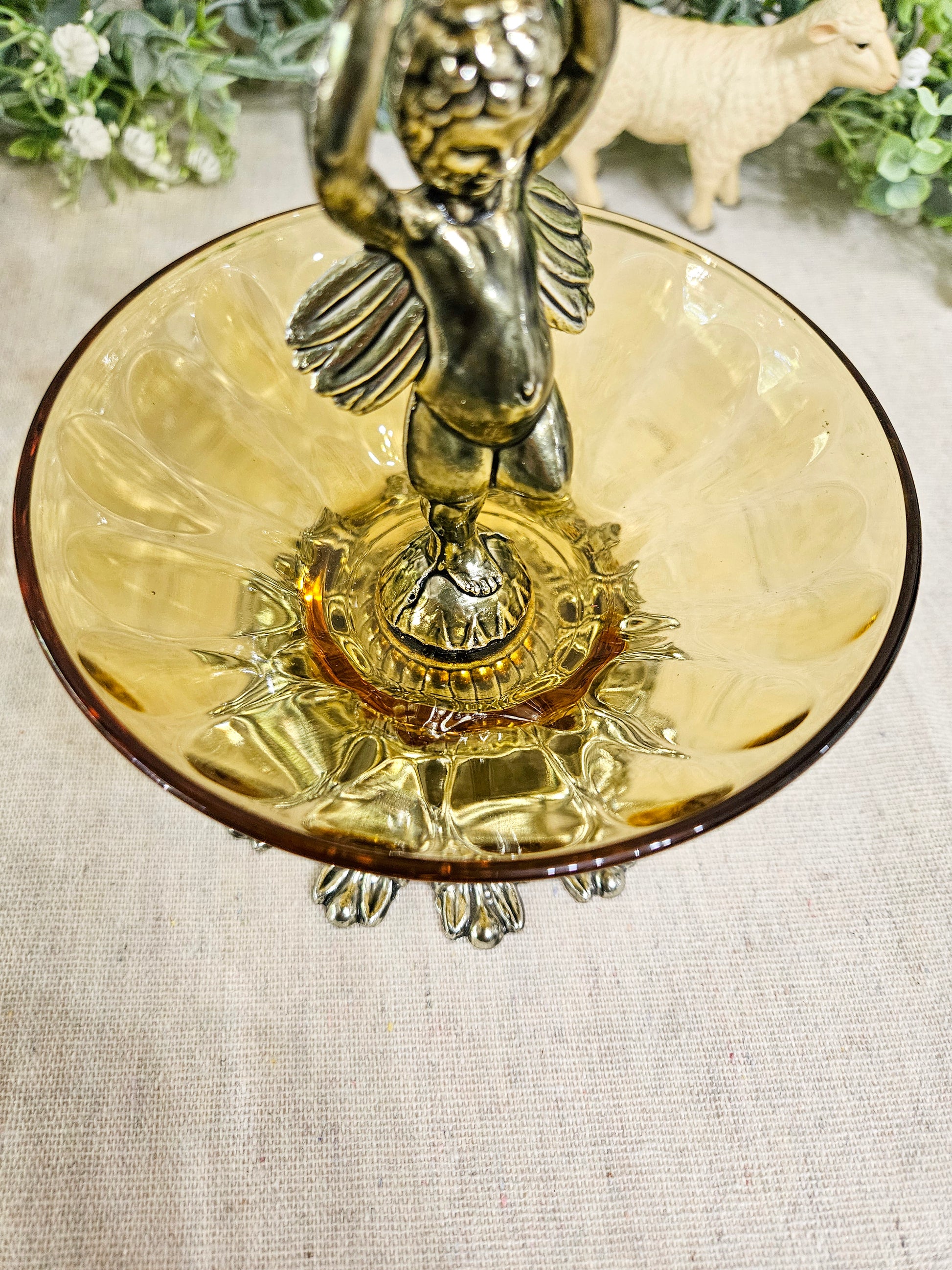 Gorgeous little cherub set in a two tier amber colored glass dish/candle holder and cast metal. This would make a stunning addition to a fancy dinner table vignette. The elegant base features 12 gold colored leaves. The bottom amber glass bowl has a lovely oval inlay design around the whole bowl.