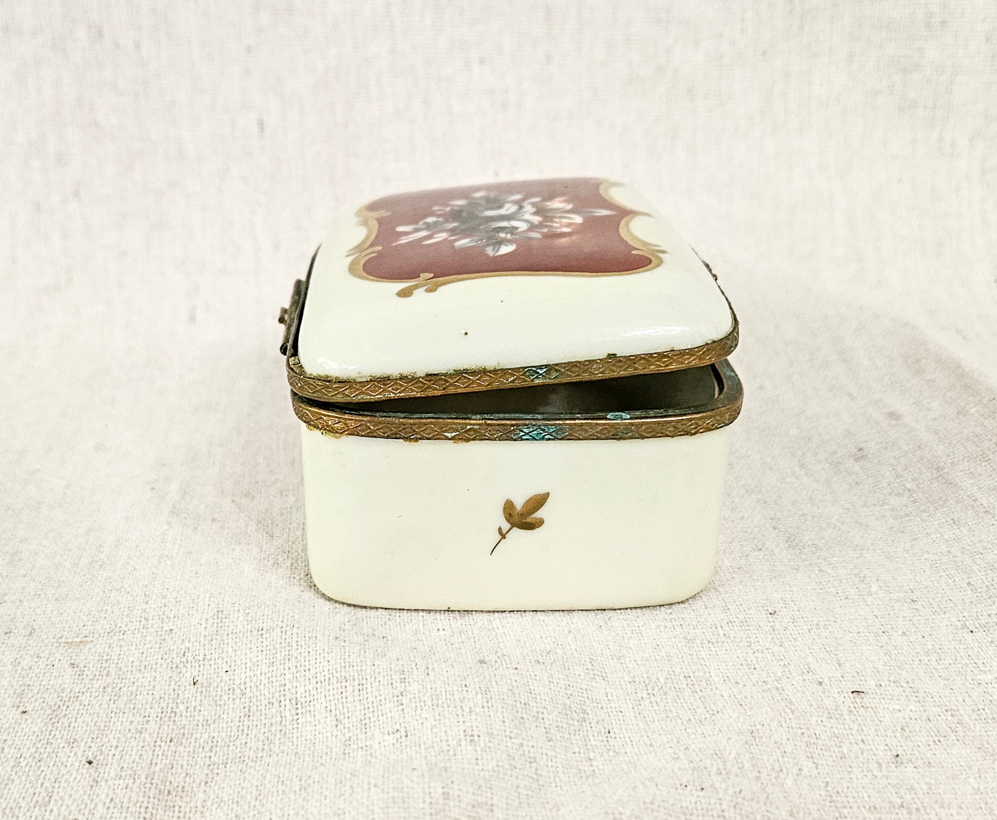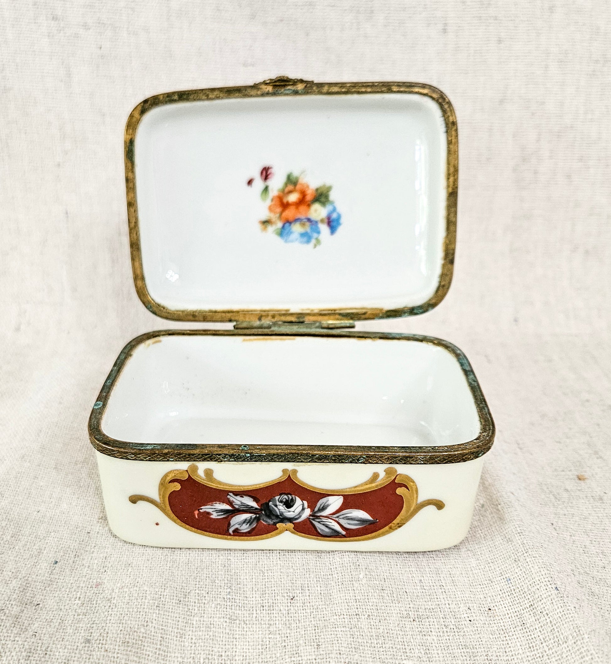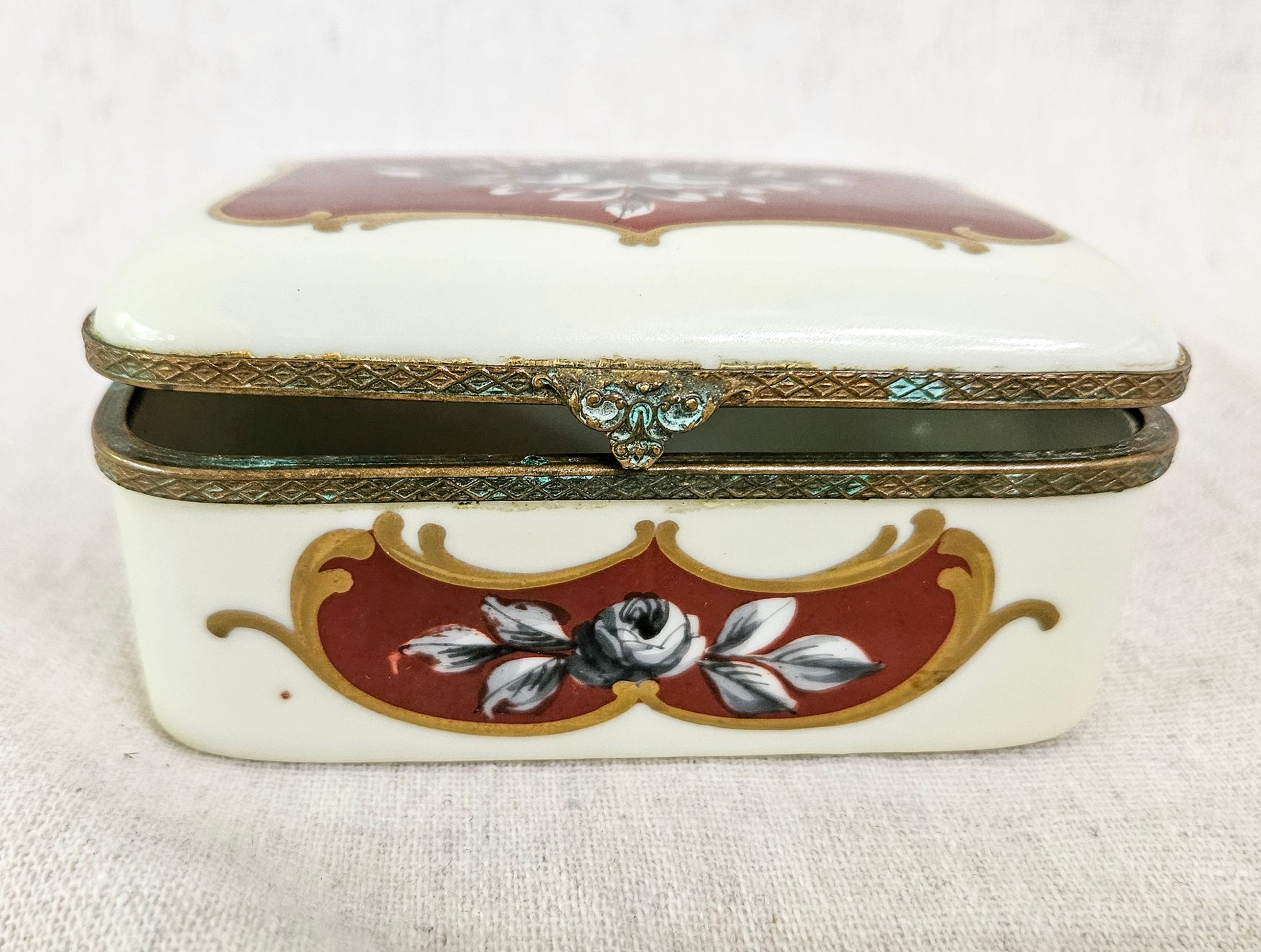 The bronze metal trim does show some wear and verdigris. The hinges no longer allow for a full close. The trinket box stays slightly open.