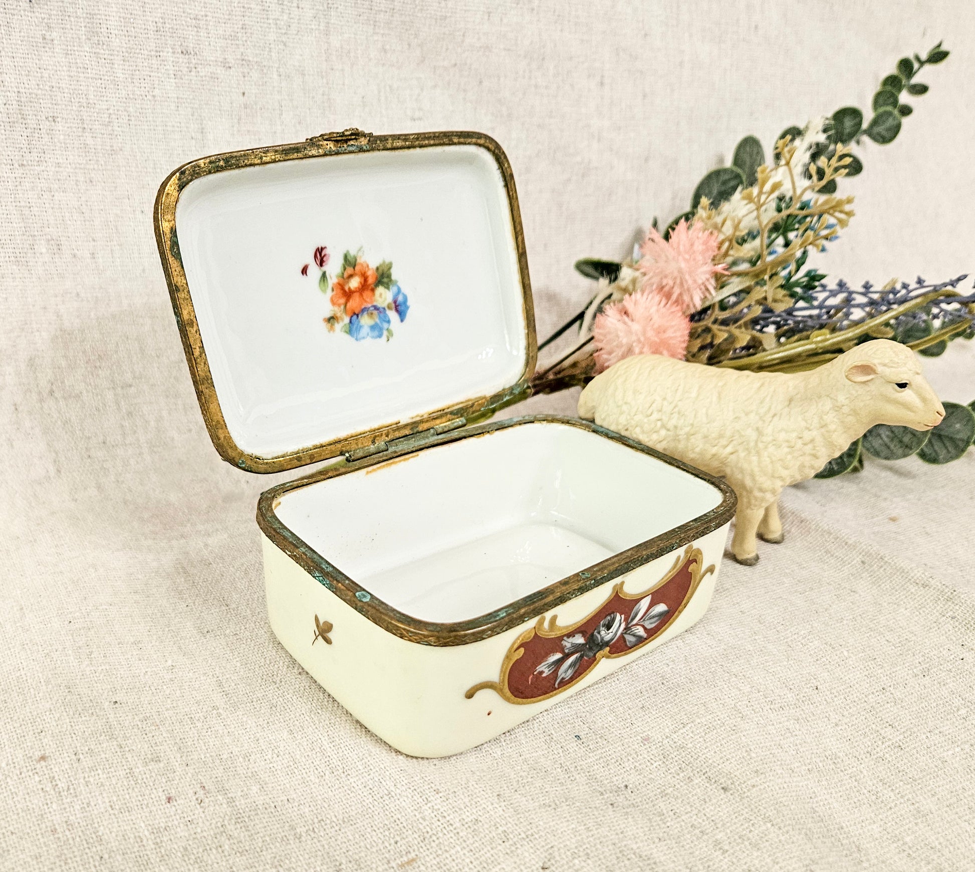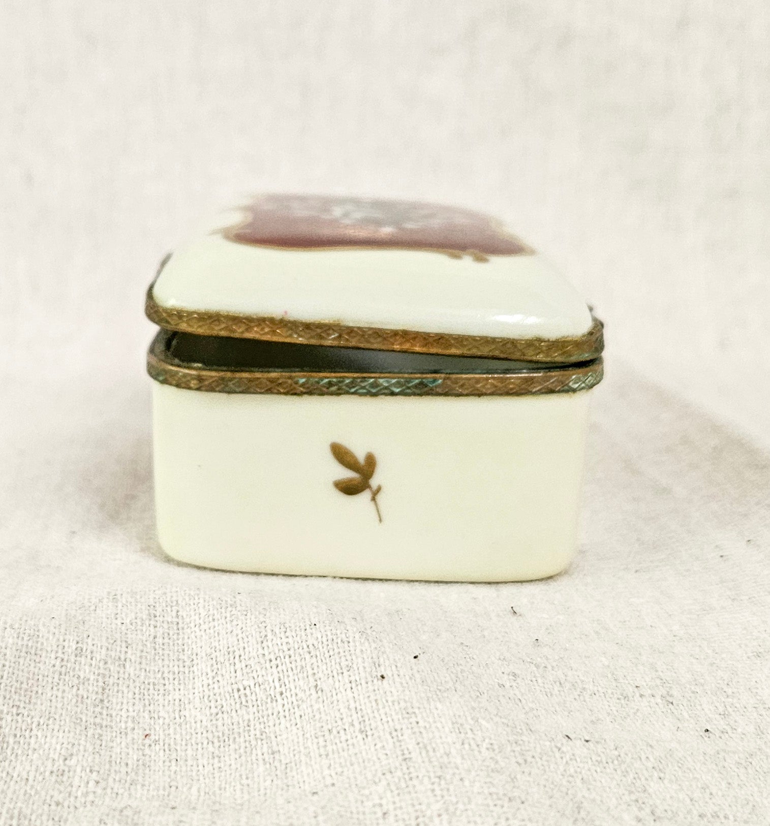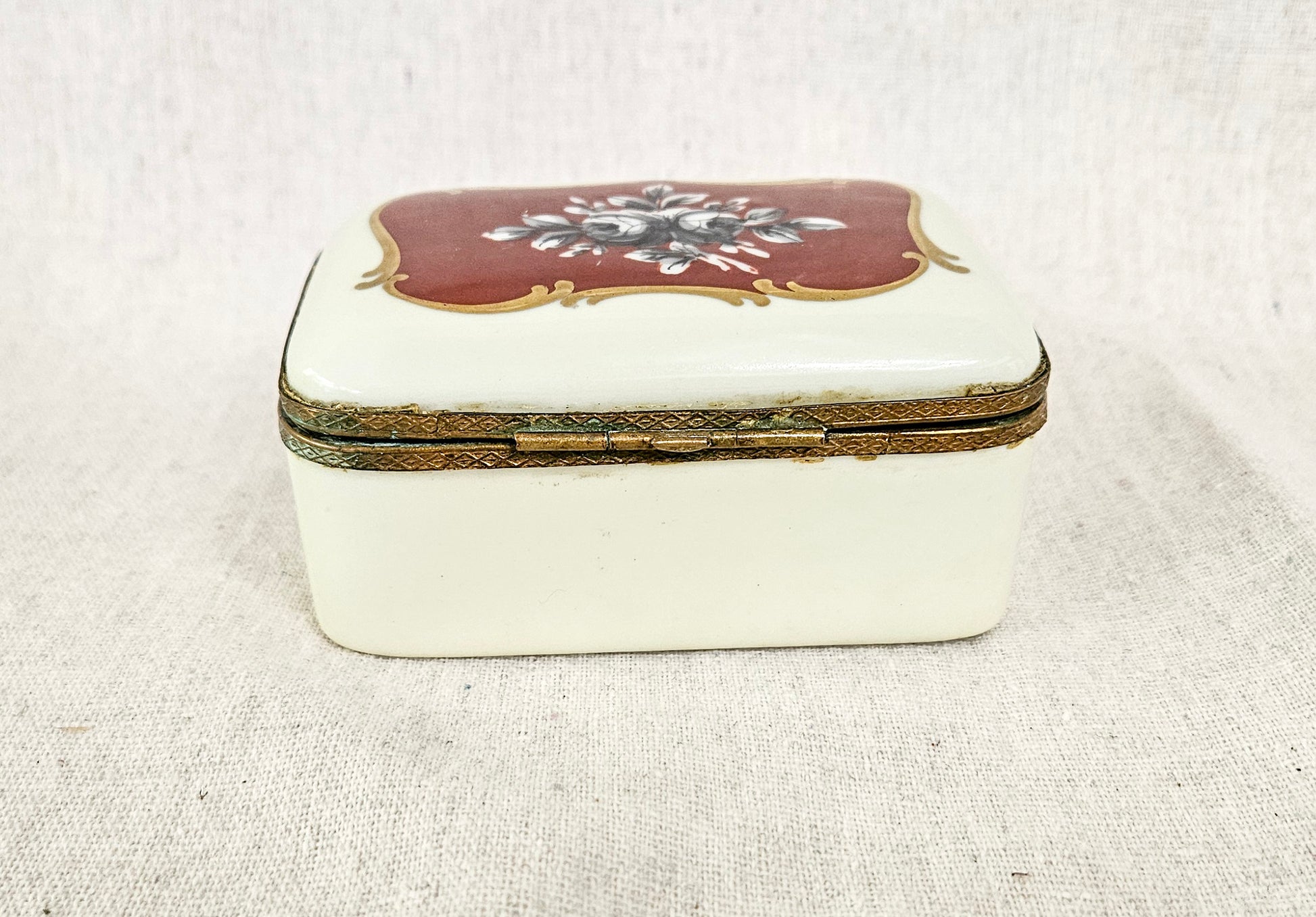 The bronze metal trim does show some wear and verdigris. The hinges no longer allow for a full close. The trinket box stays slightly open.