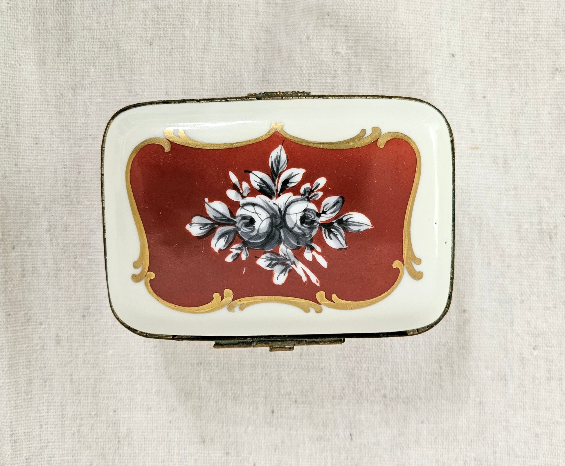 This elegant antique jewelry trinket box would make a lovely accent to any vanity or dresser. The outer decoration is made up of black and white garden roses on a deep plum red background framed in with gold gilt. The sides of the box feature petite gold leaf stems. When you open the porcelain trinket box you are met with a cluster of cheerful hand painted flowers.