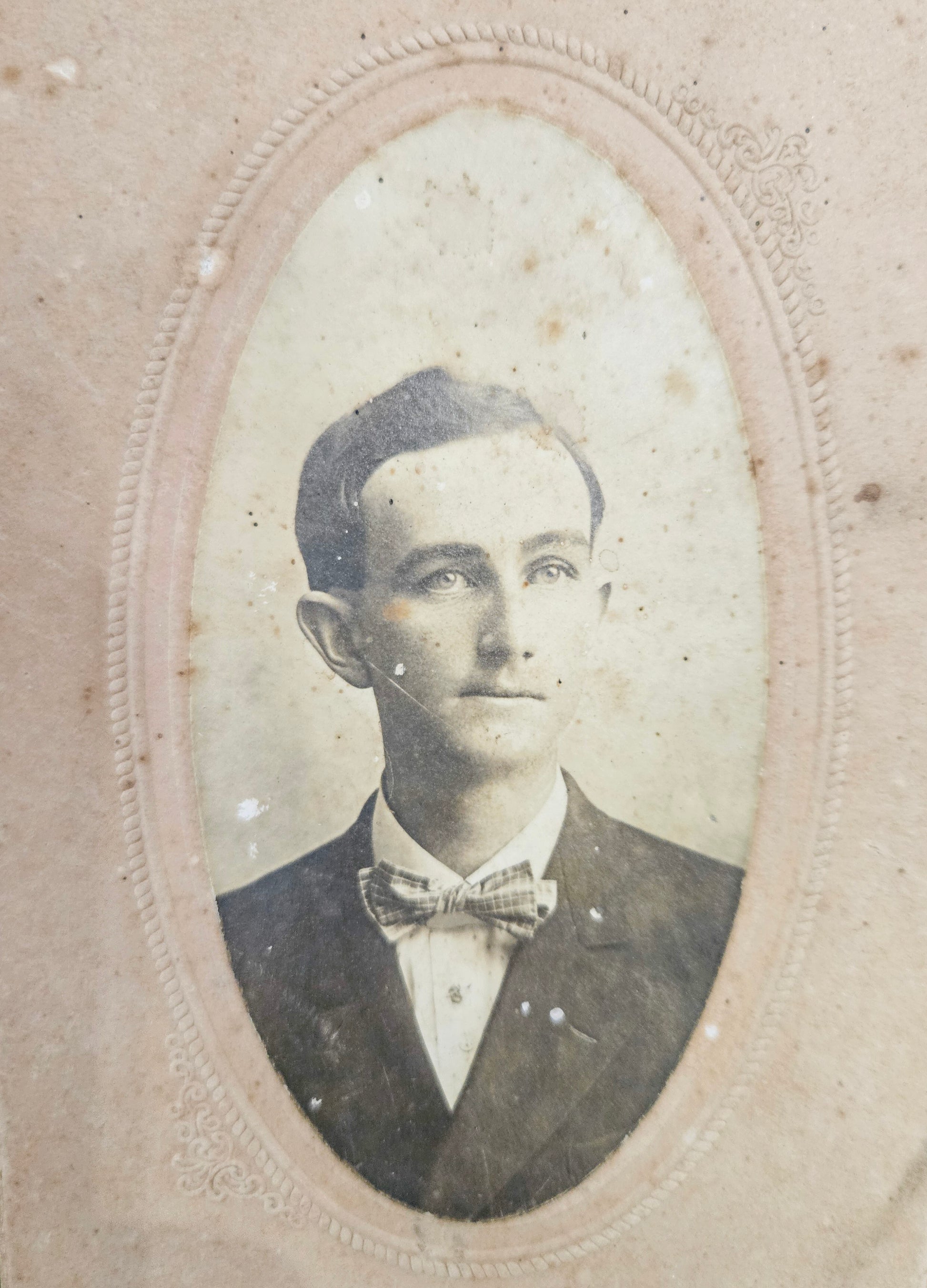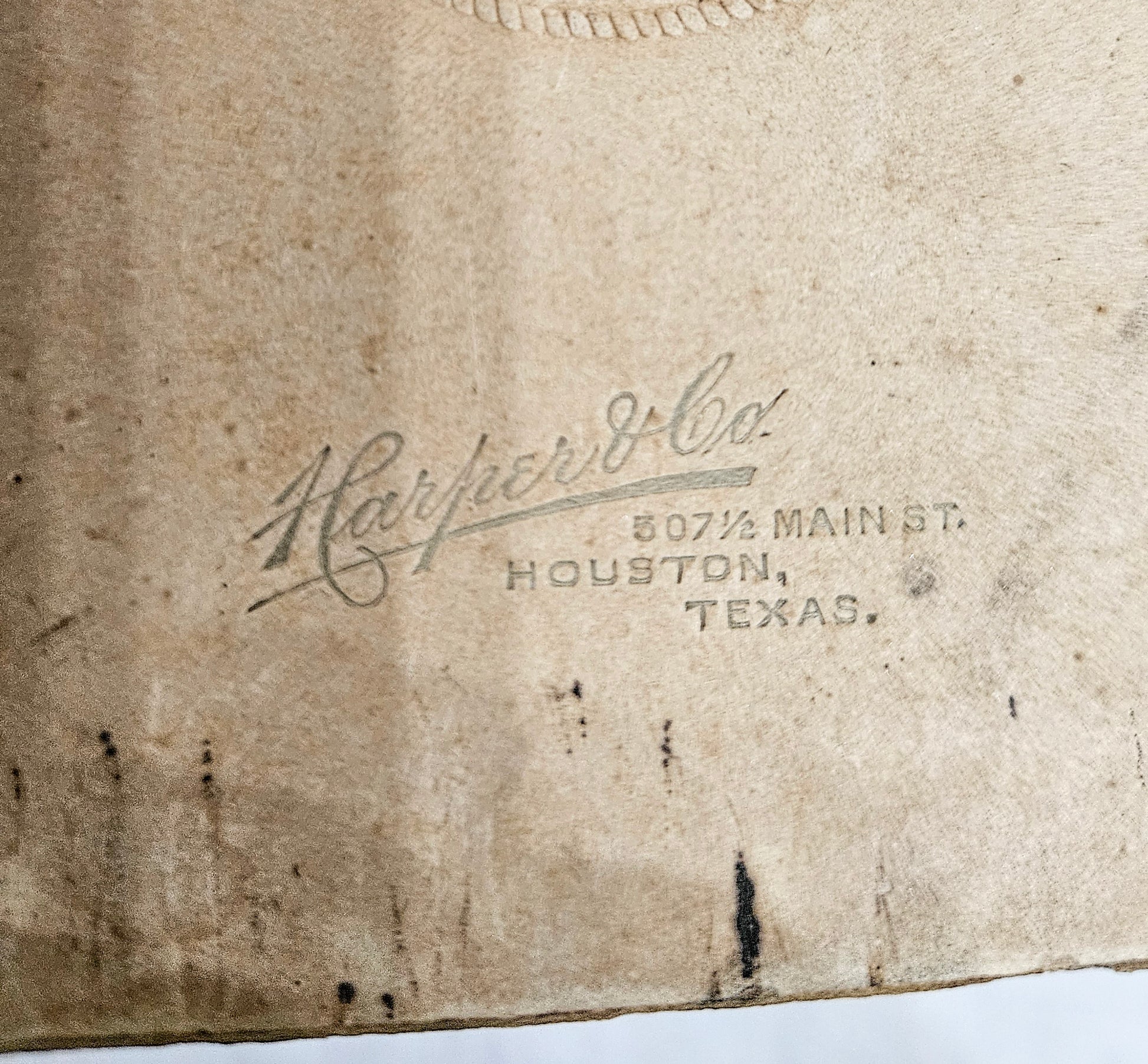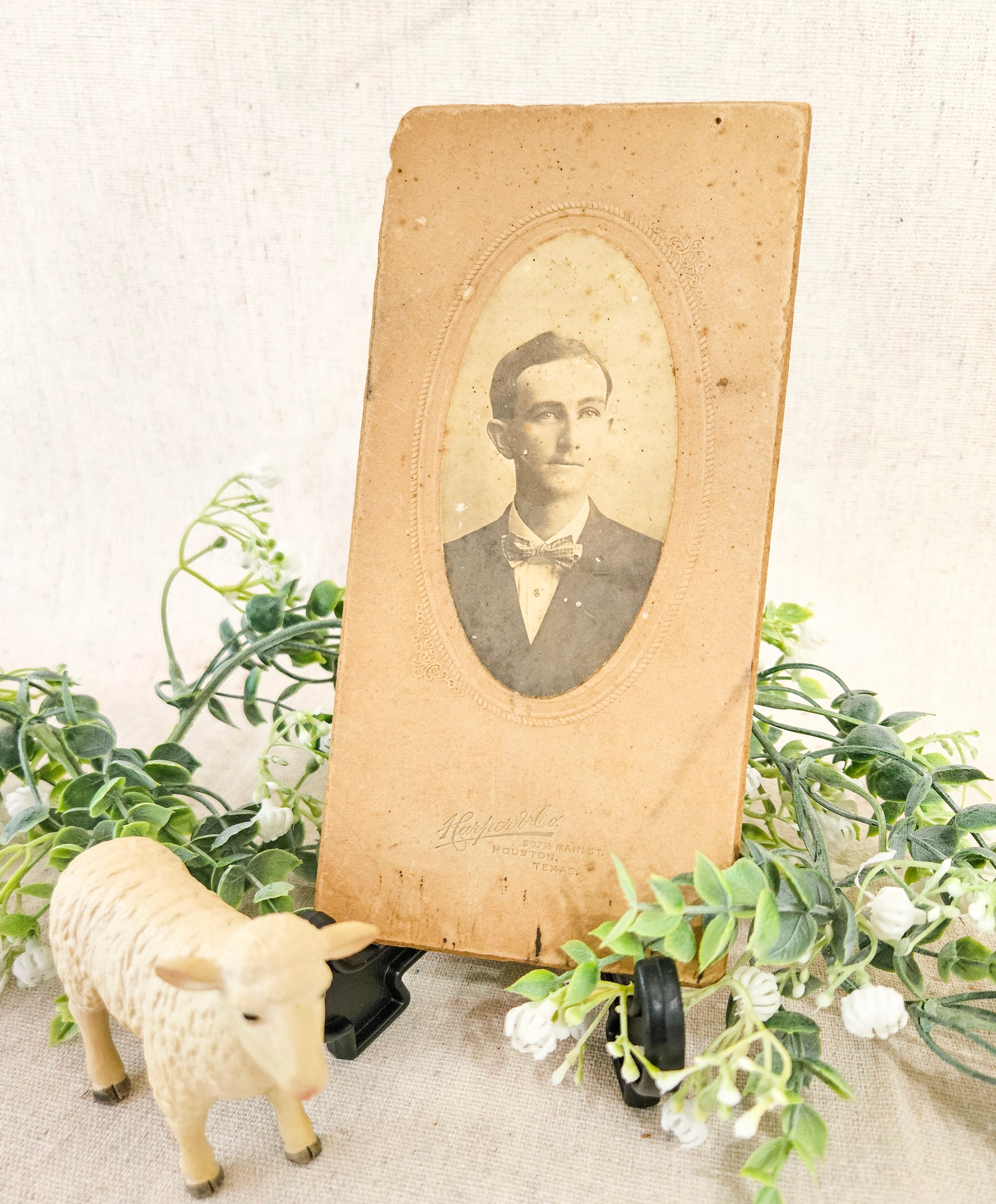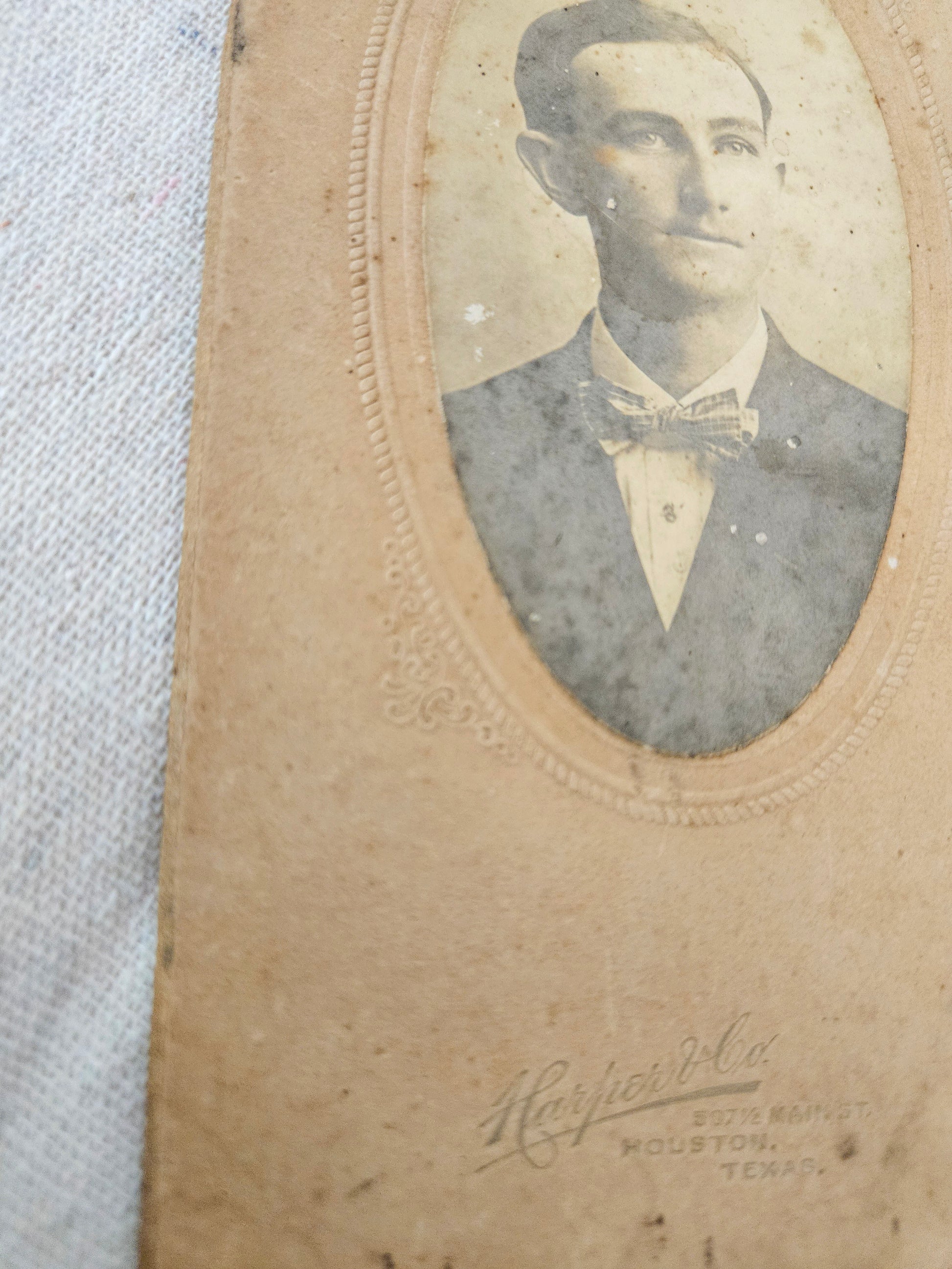 A black and white headshot photo of a young gentleman dressed in a suit and bowtie. The embossed Studio card is stamped with Harper & Co. 507 1/2 Main St. Houston, TX. The original business building still stands.