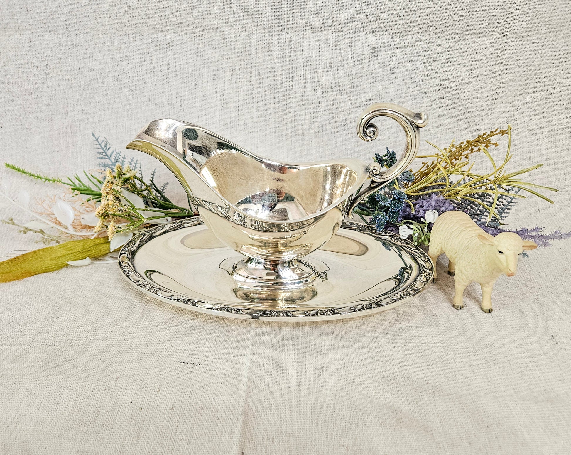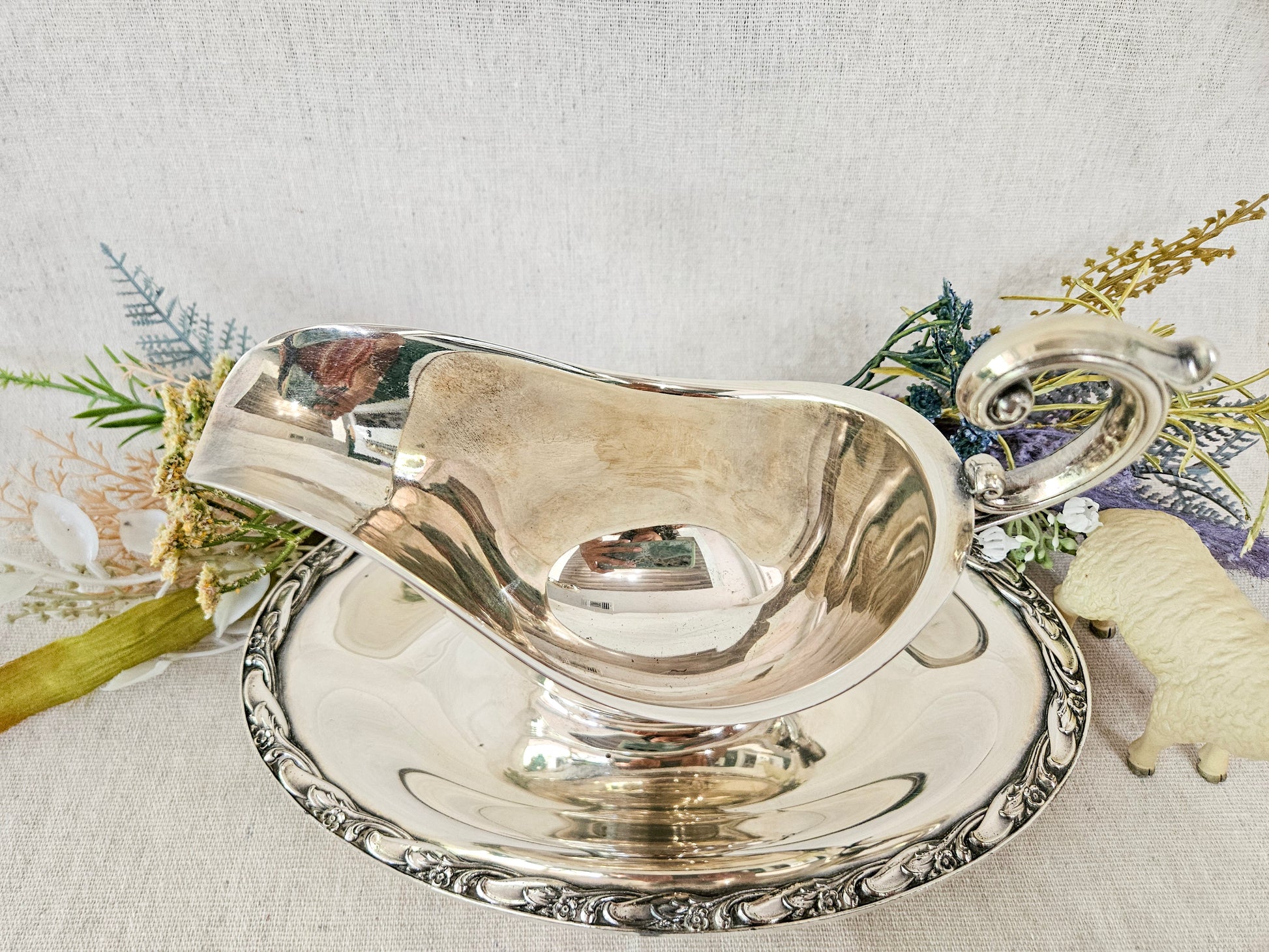 This is the 1847 Rogers Bros, Exquisite silver plated oval gravy bowl dish. 1847 Rogers Bros” was a trademark used starting in 1862. It has a wonderful, yet simple flower design on the brim of the dish. The handle's design makes it easy to grab, and easy to hold while pouring.