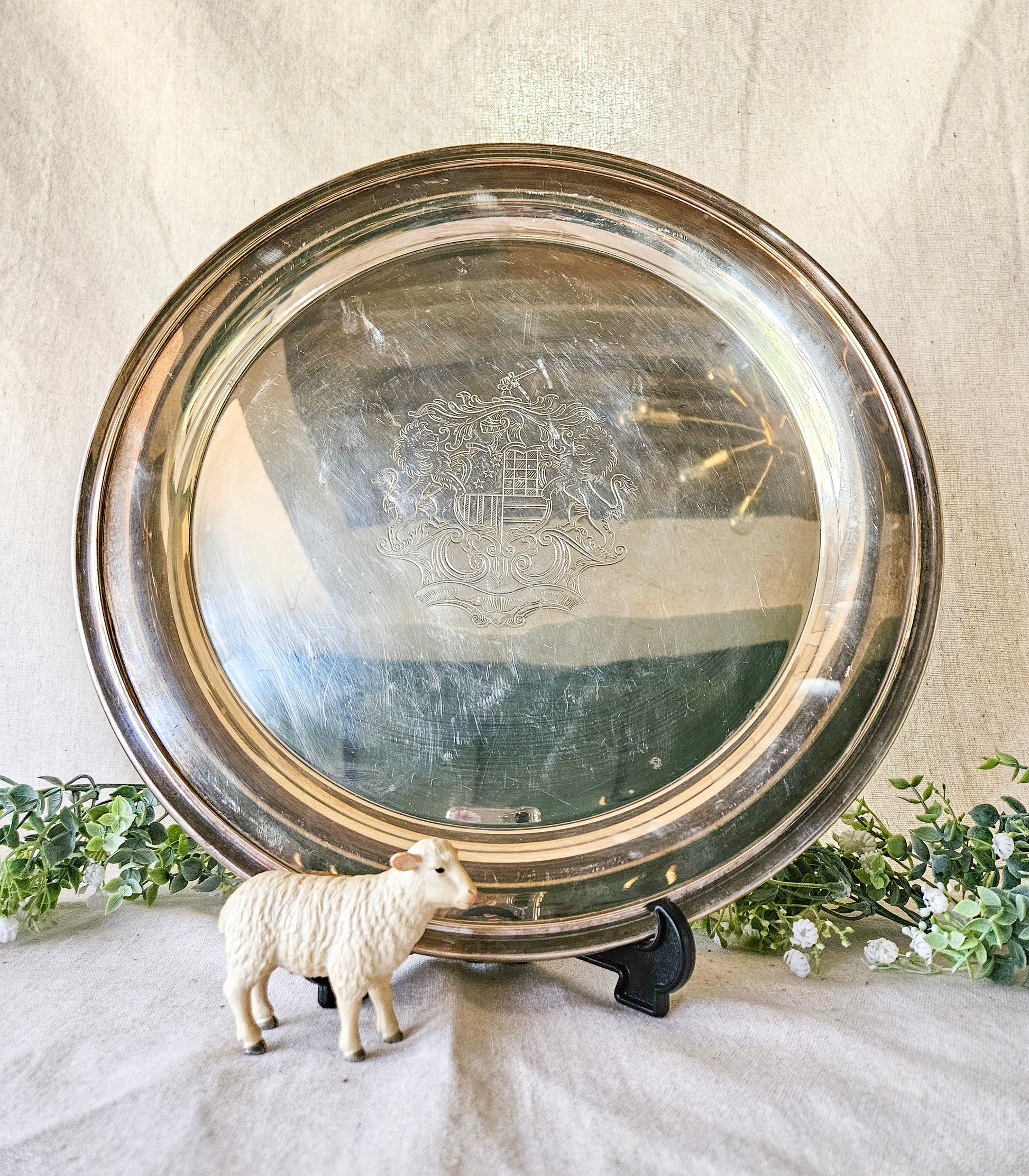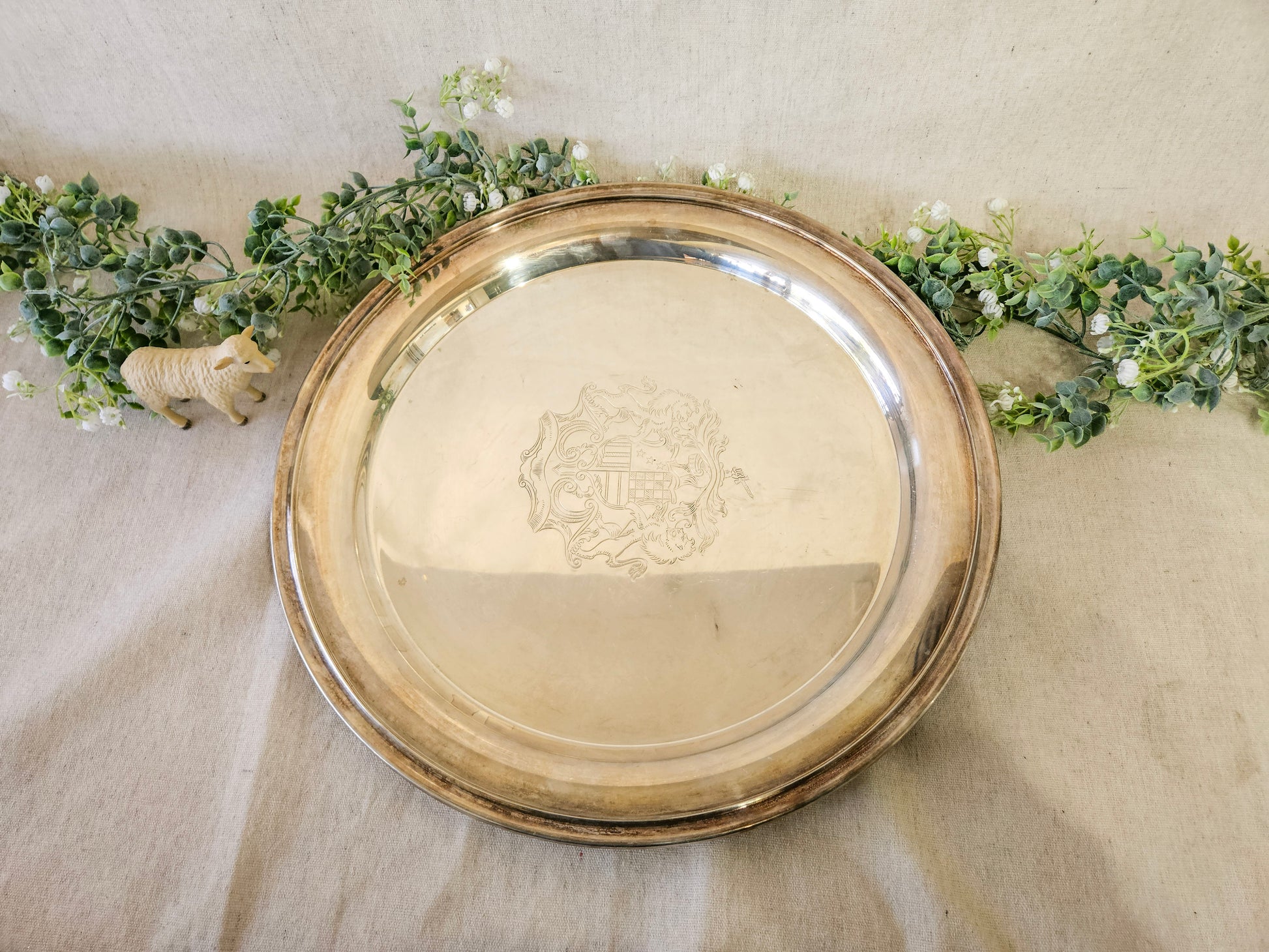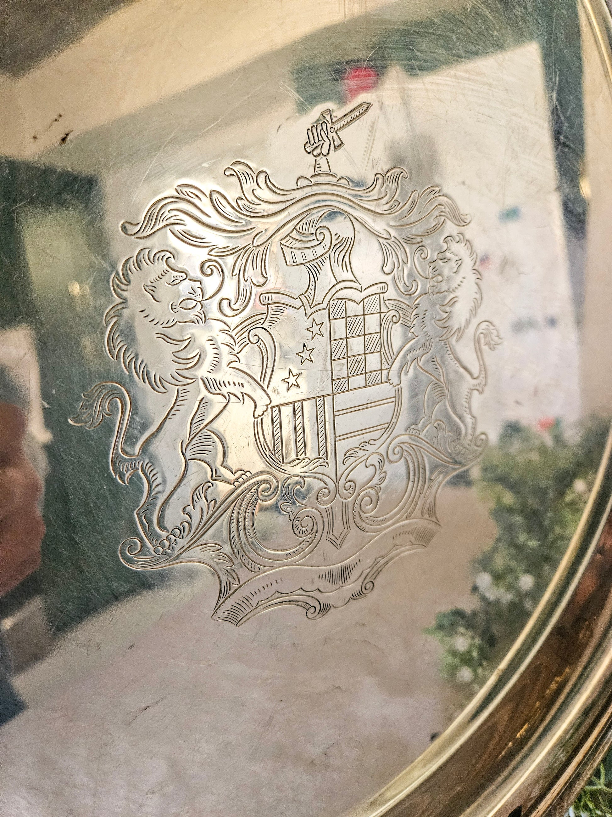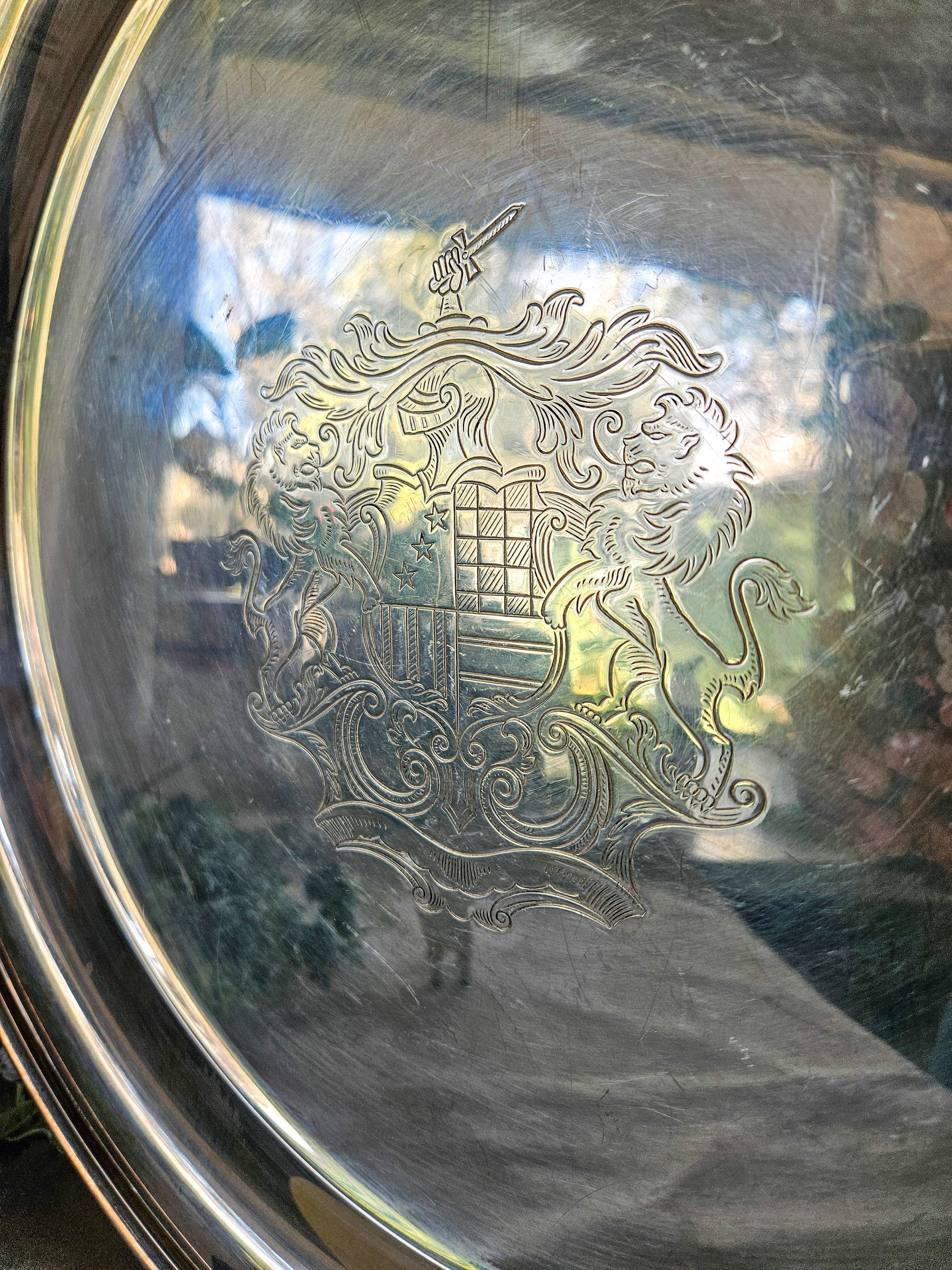 Available is a stunning, large Heraldic Crested Silverplate Armorial Tray by Webster Wilcox International Silver Co.