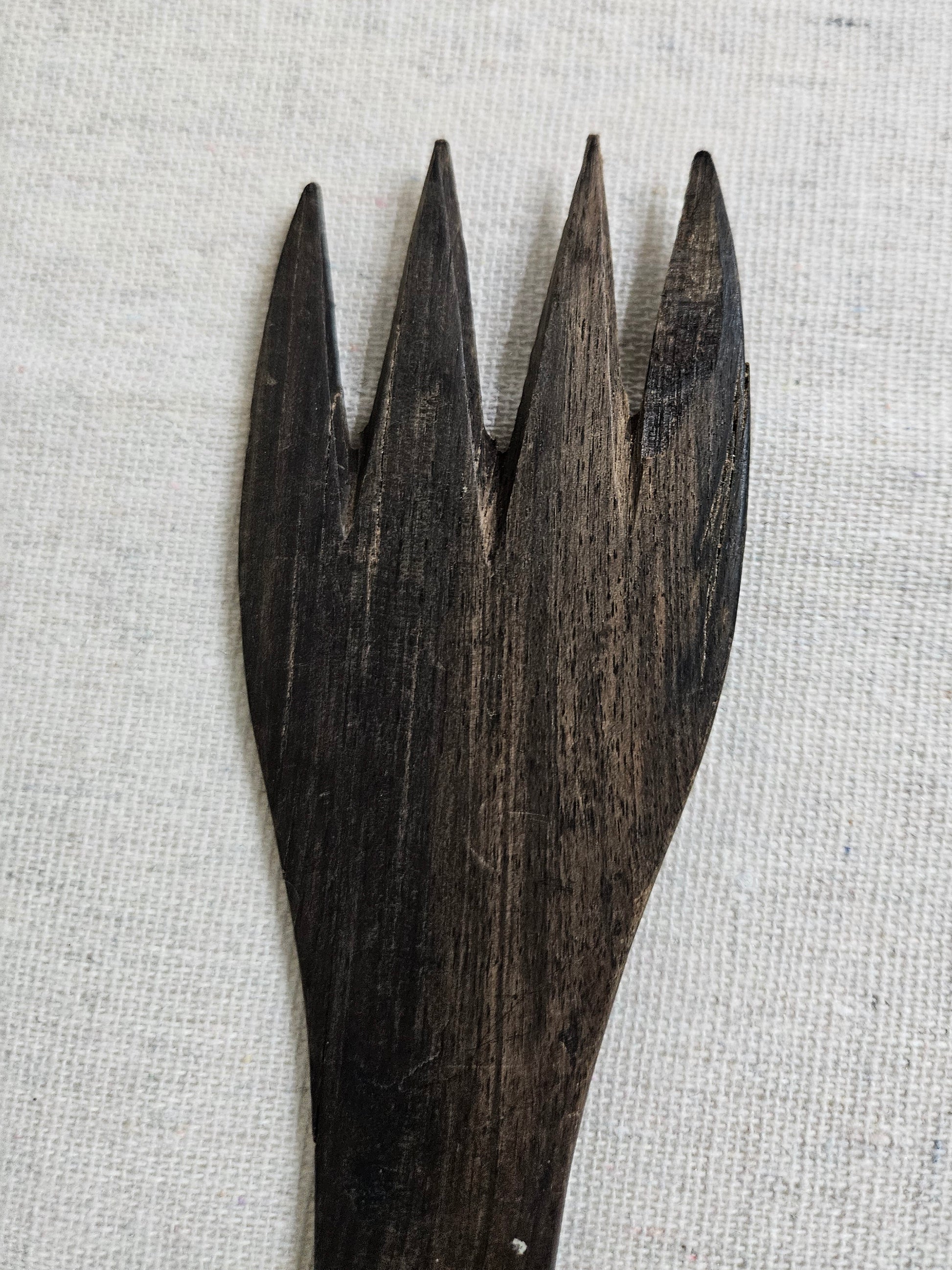 A pair of usable ebony or teak wood salad servers with hand-carved handles possibly in the shape of crocodiles. The servers are in good vintage condition. There is a slight stable crack to one side of the fork and in the spoon (see photo).