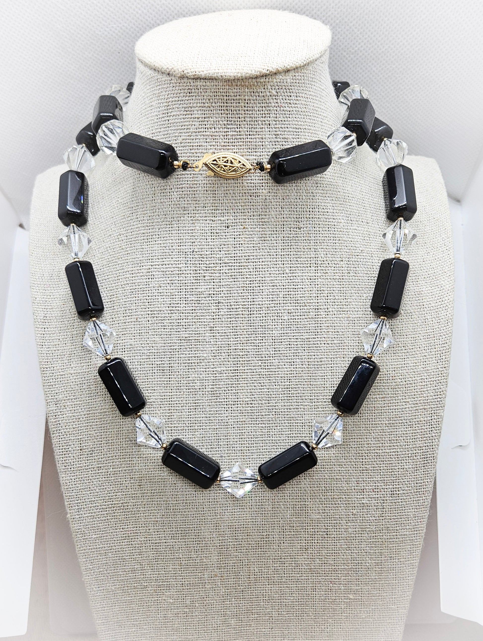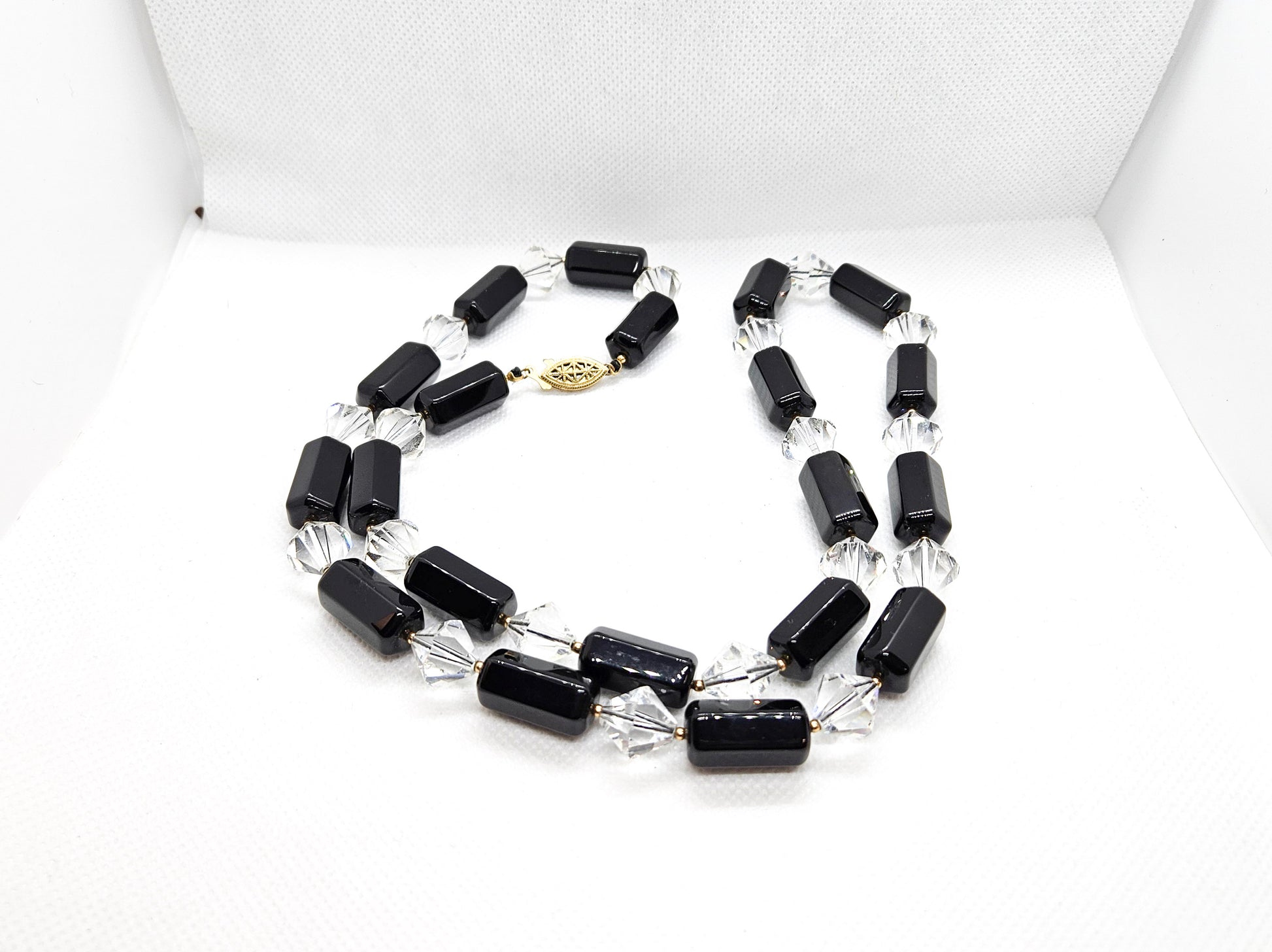 Available is a beautiful Vintage Black Quartz and Glass Bicone Beads Gold Filled Box Clasp Necklace. The box clasp is stamped 14/20 and an indiscernible makers mark. There does not appear to be any chips in the beads.