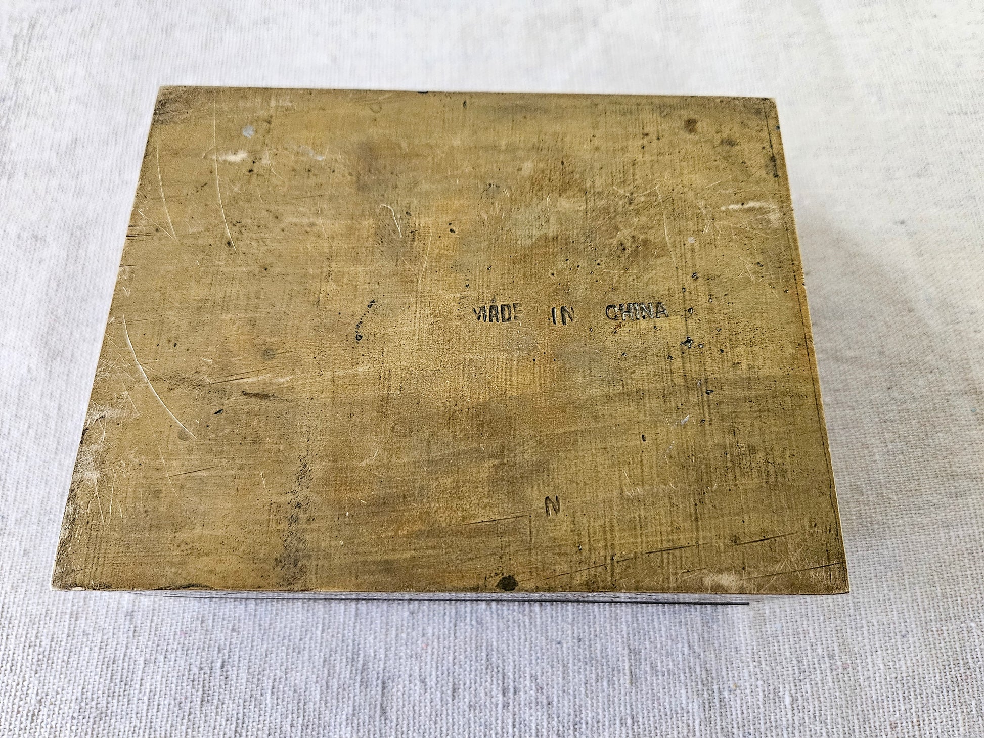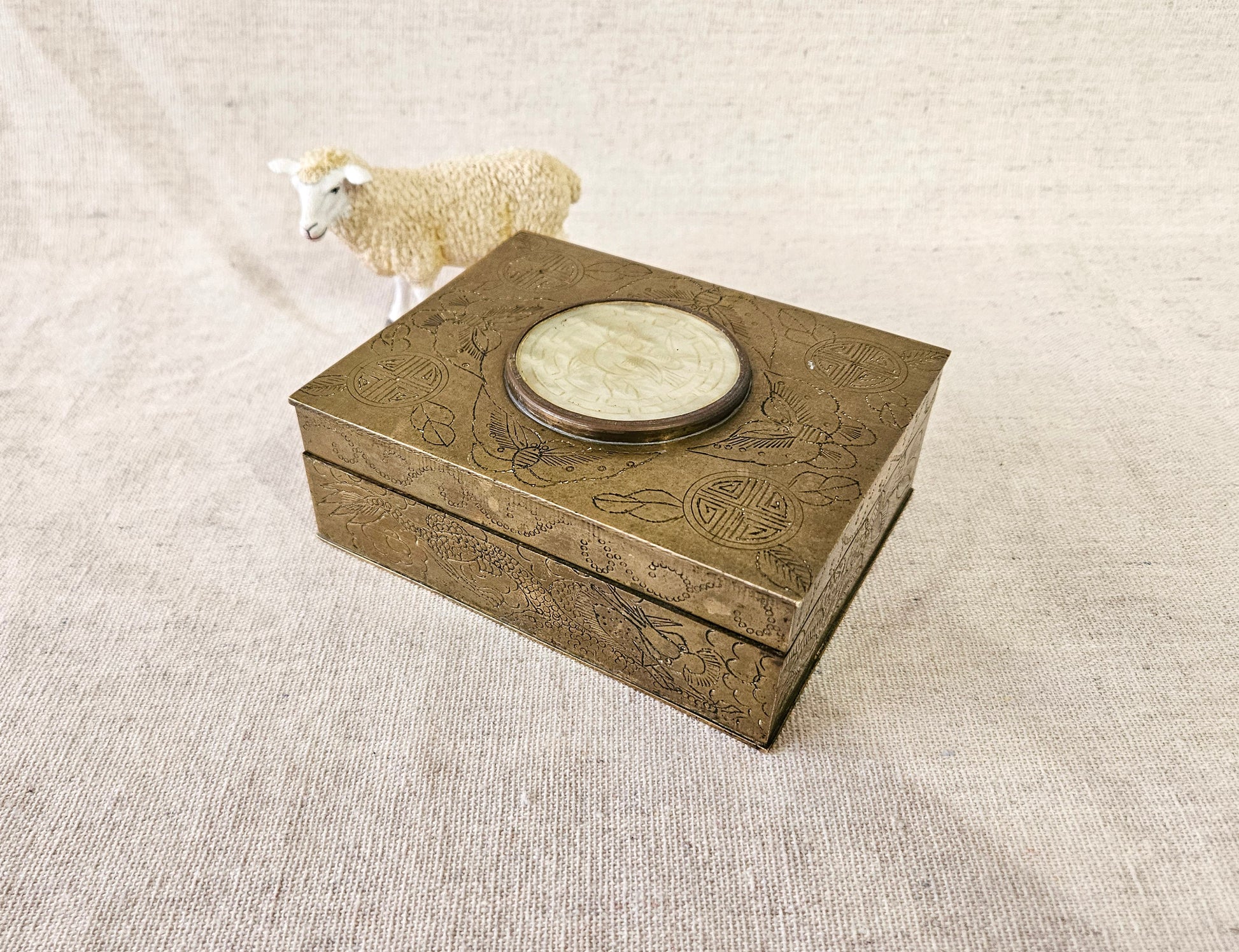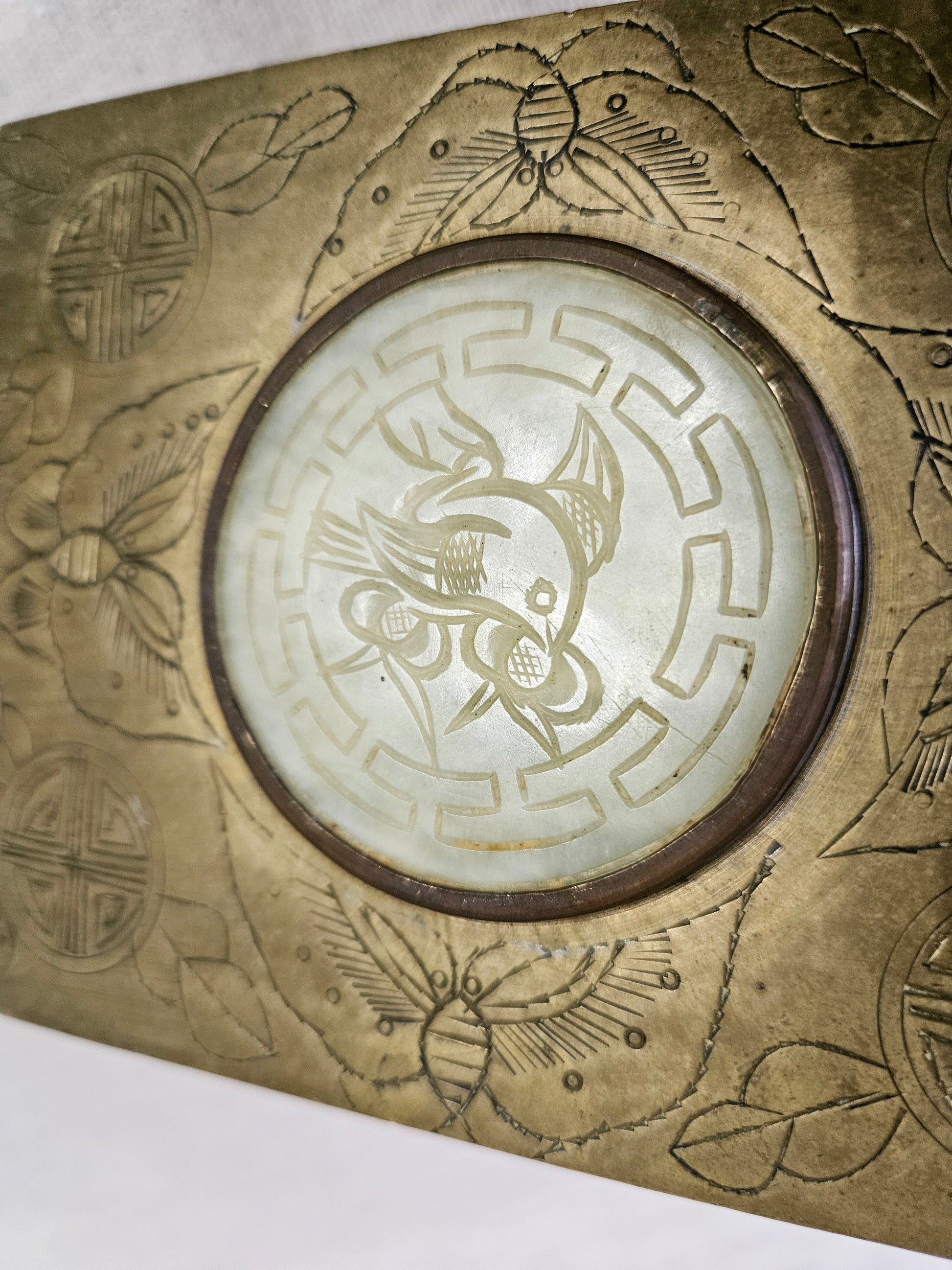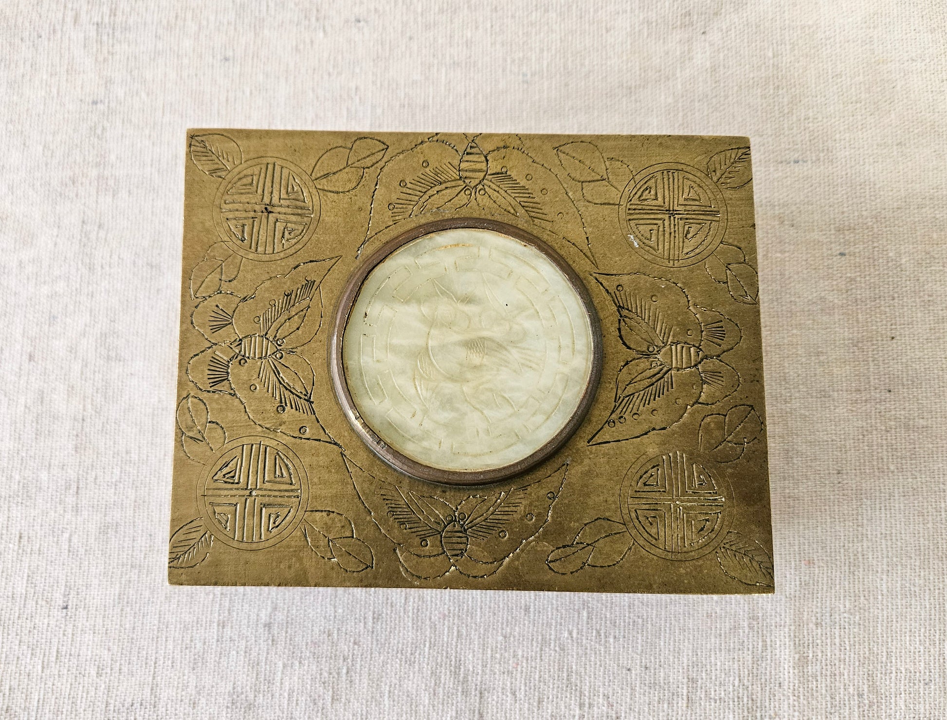 Available is Vintage Etched Brass Chinese Cigarette Box with a carved jade (untested) inlay.