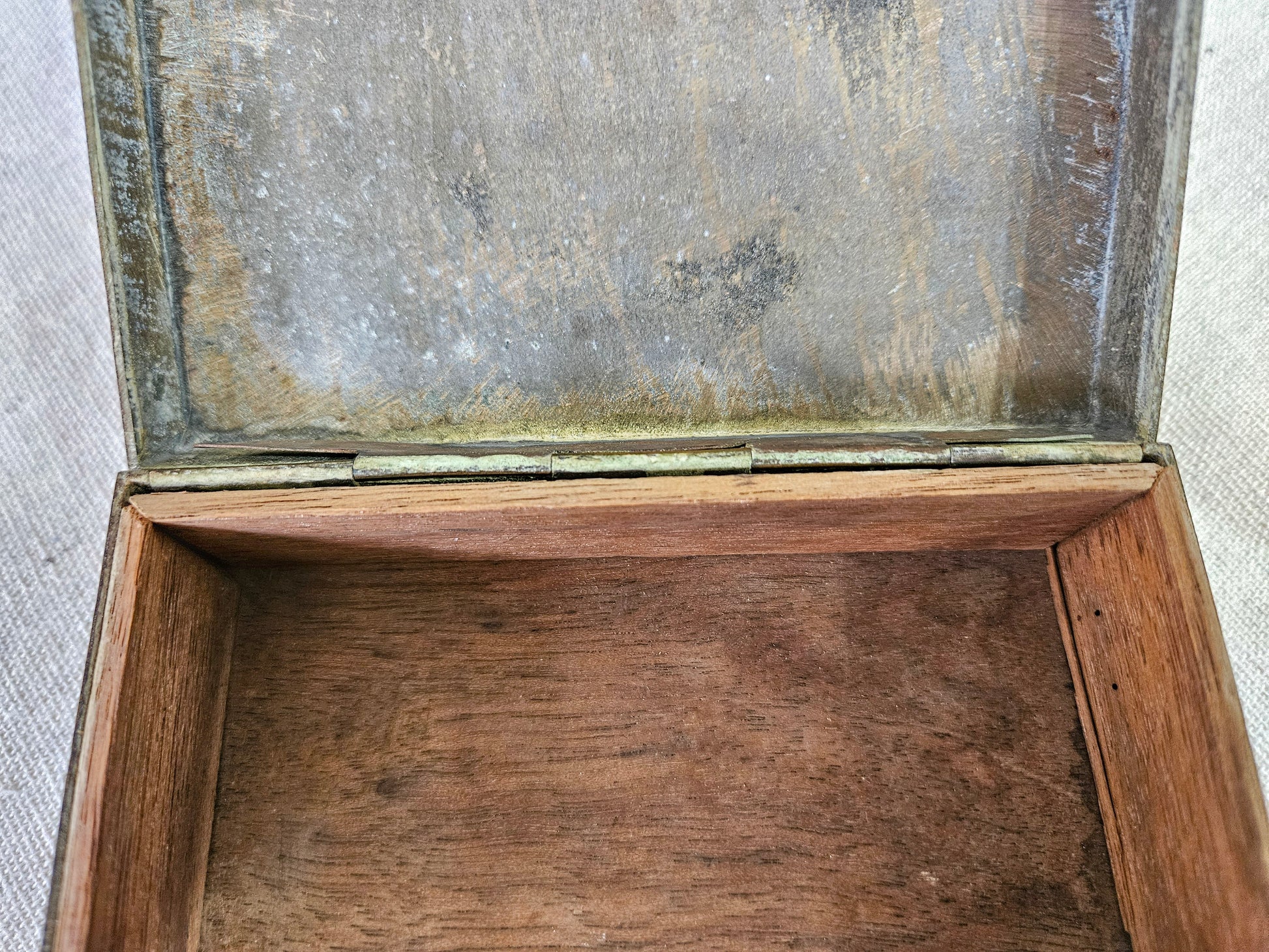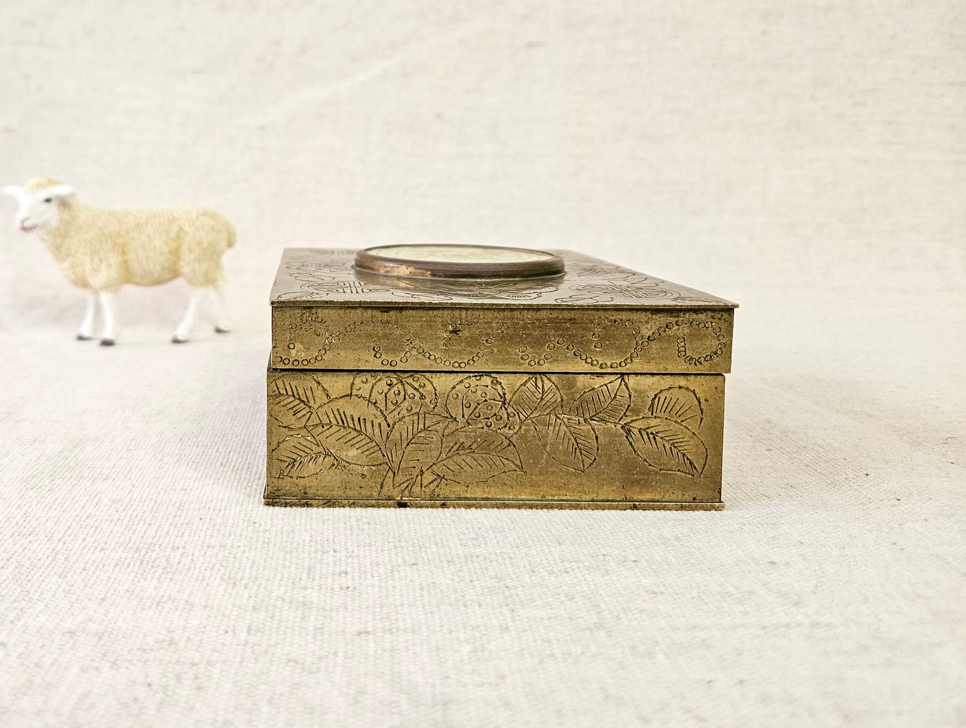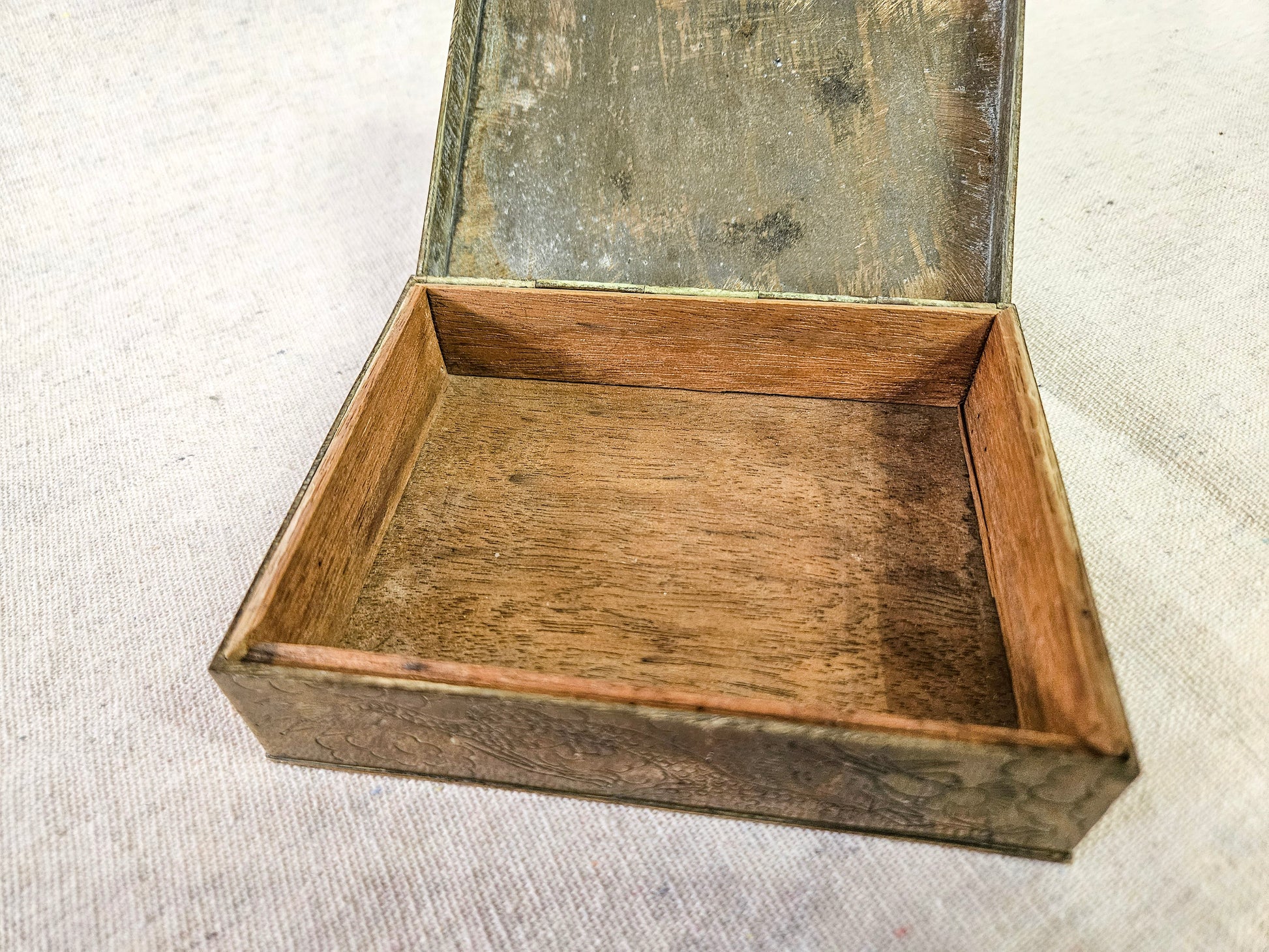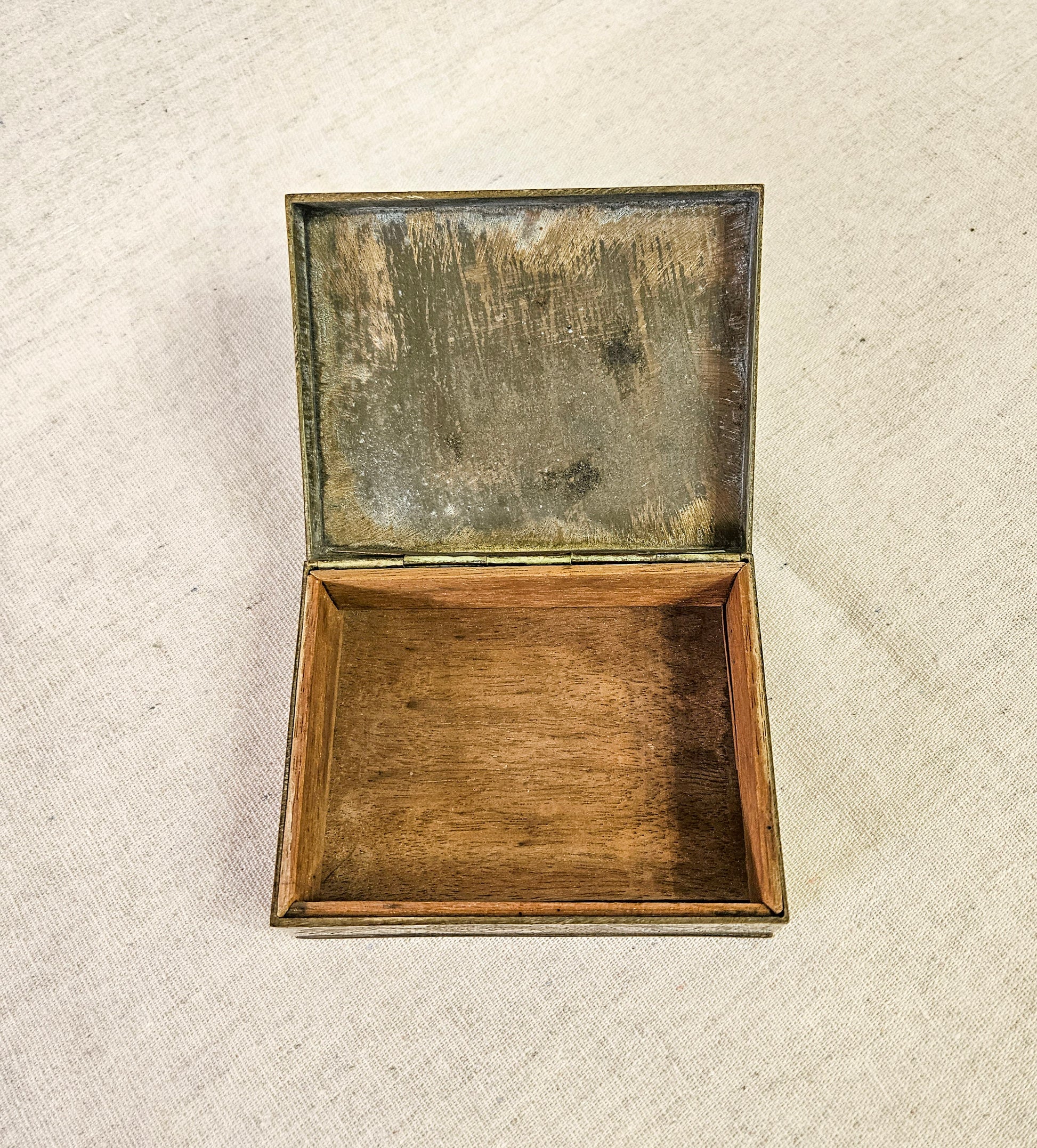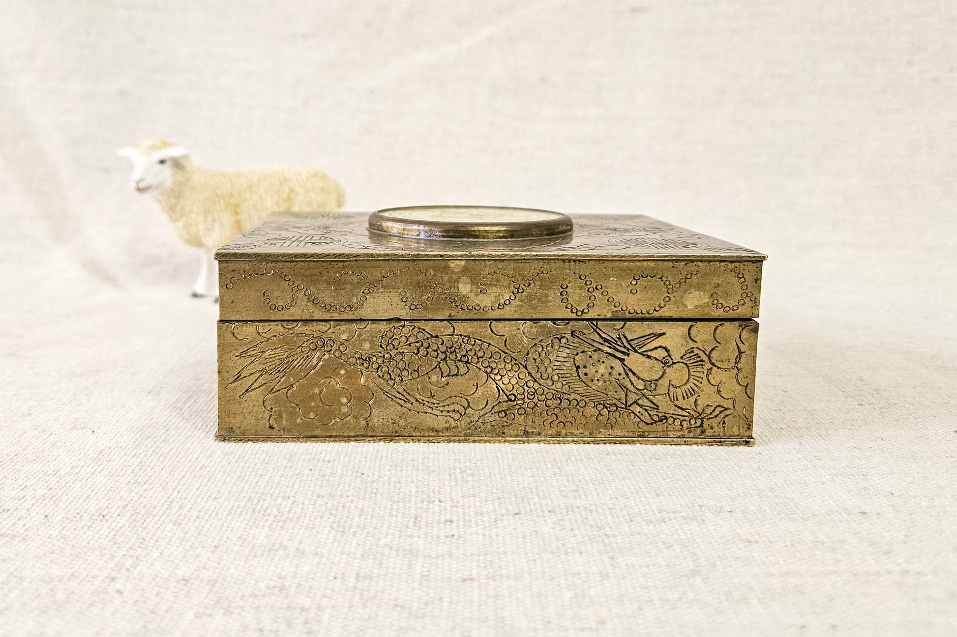 Available is Vintage Etched Brass Chinese Cigarette Box with a carved jade (untested) inlay.