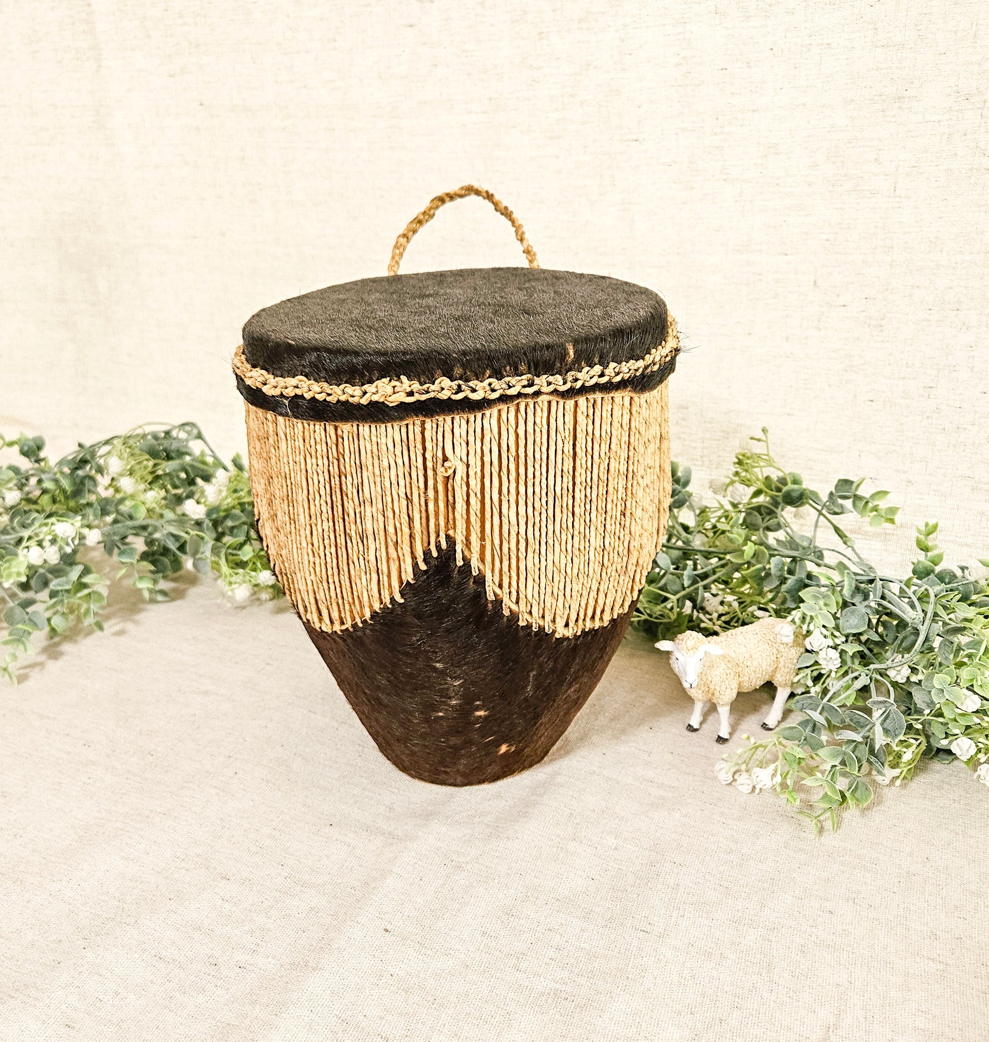 Small African Namunjoloba Uganda Animal Hide Drum. This drum does not have a shaker rattle inside. It is in good condition, however, some of the hide is worn. It may be worn due to use or it may be the original condition.