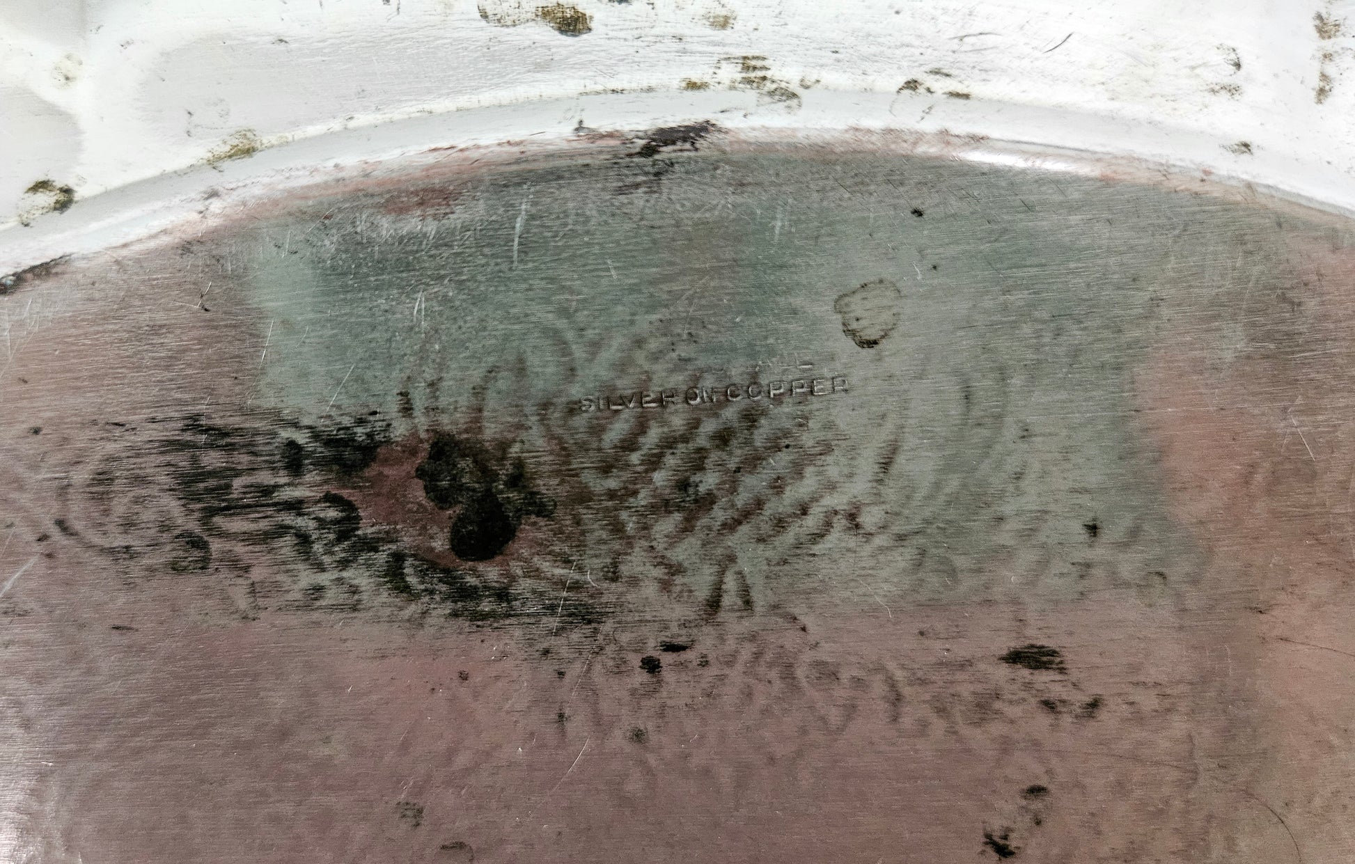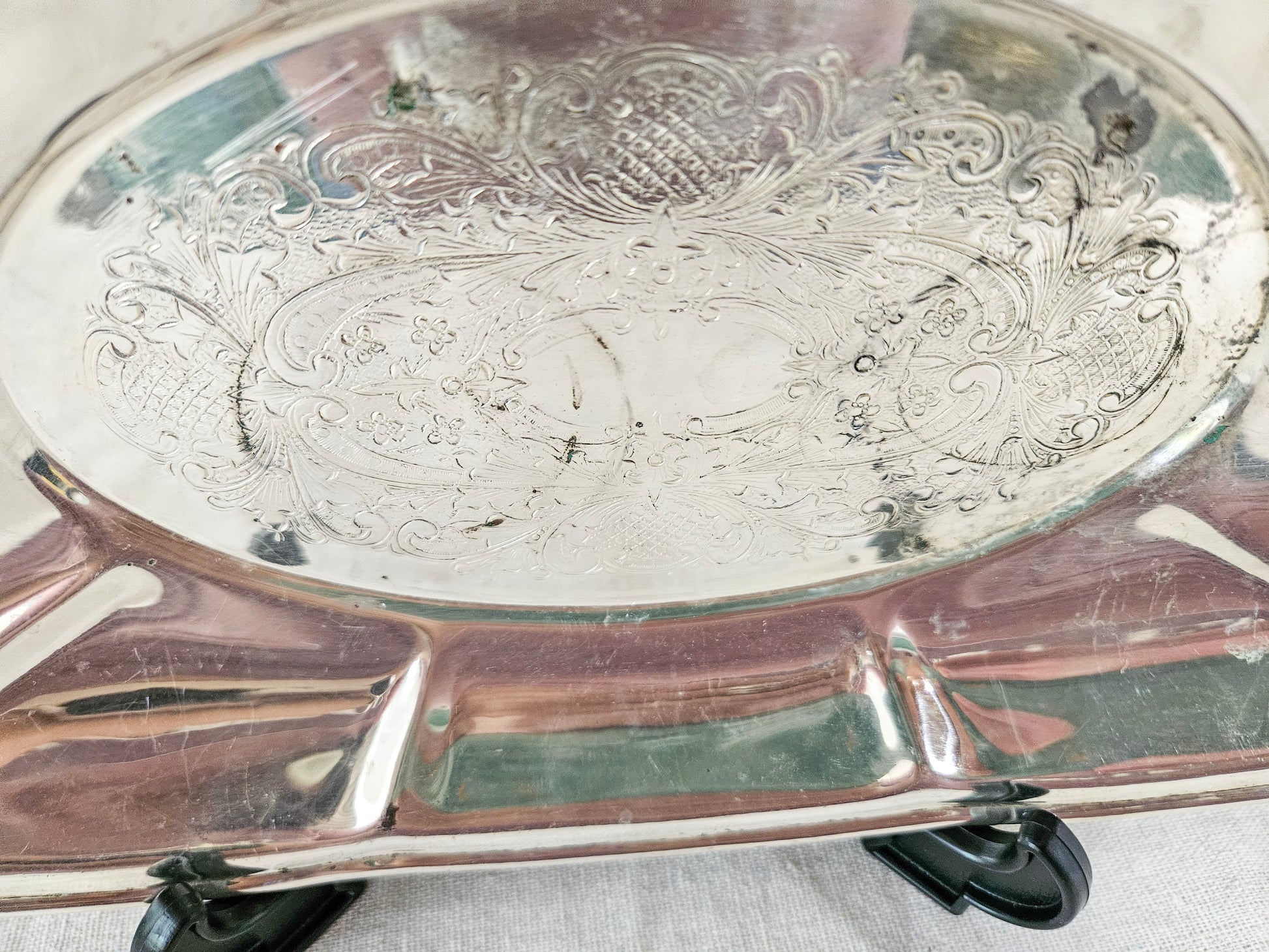 This is a mid century silverplated oval bread tray with an etched interior design and a scalloped rim. The construction is silver over copper.