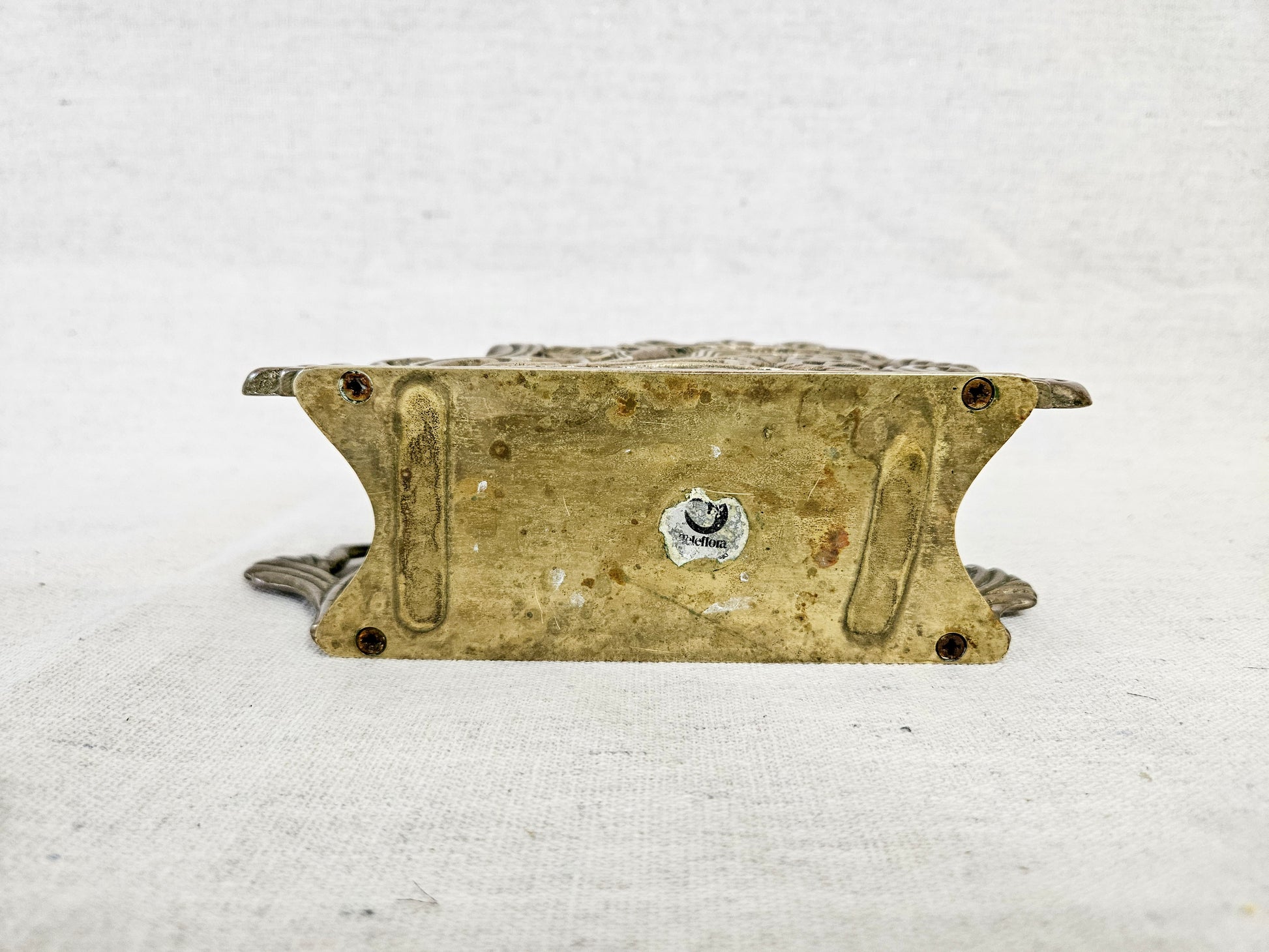 This vintage napkin holder is made of a heavy brass. It has a Teleflora sticker on the bottom. It has light wear and otherwise in good vintage condition. There are some spots of tarnish on the inside and missing foam pads on the bottom.
