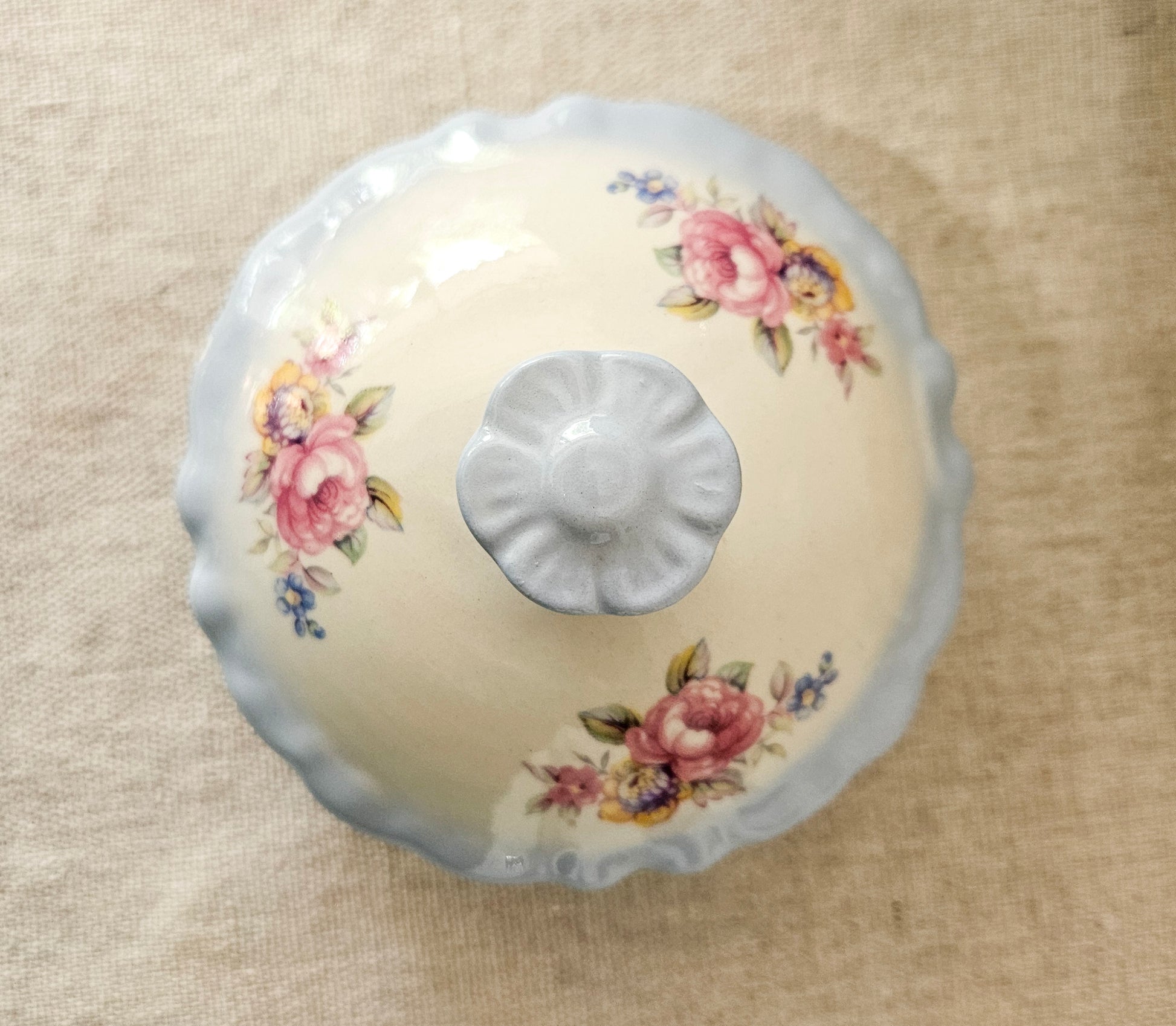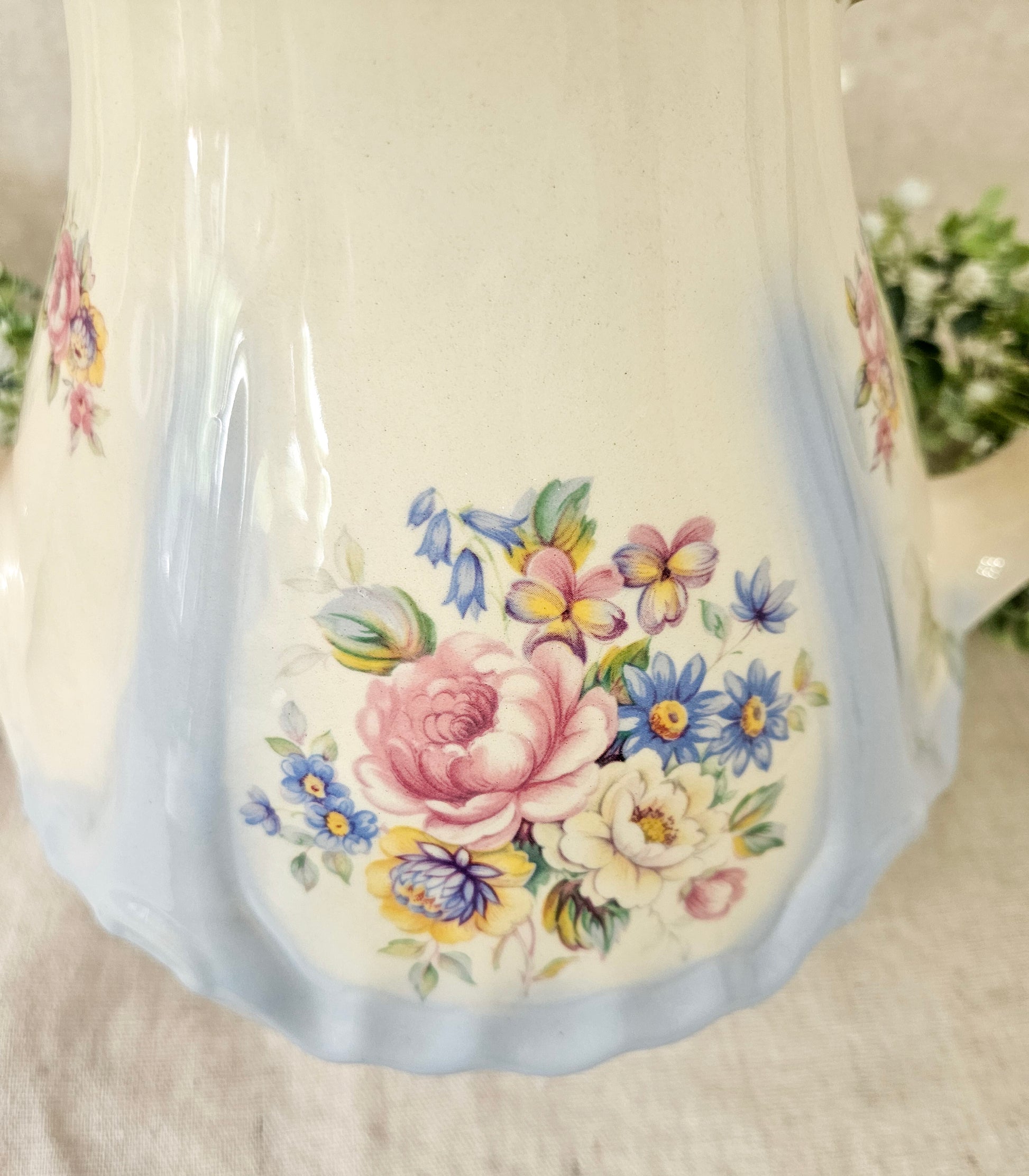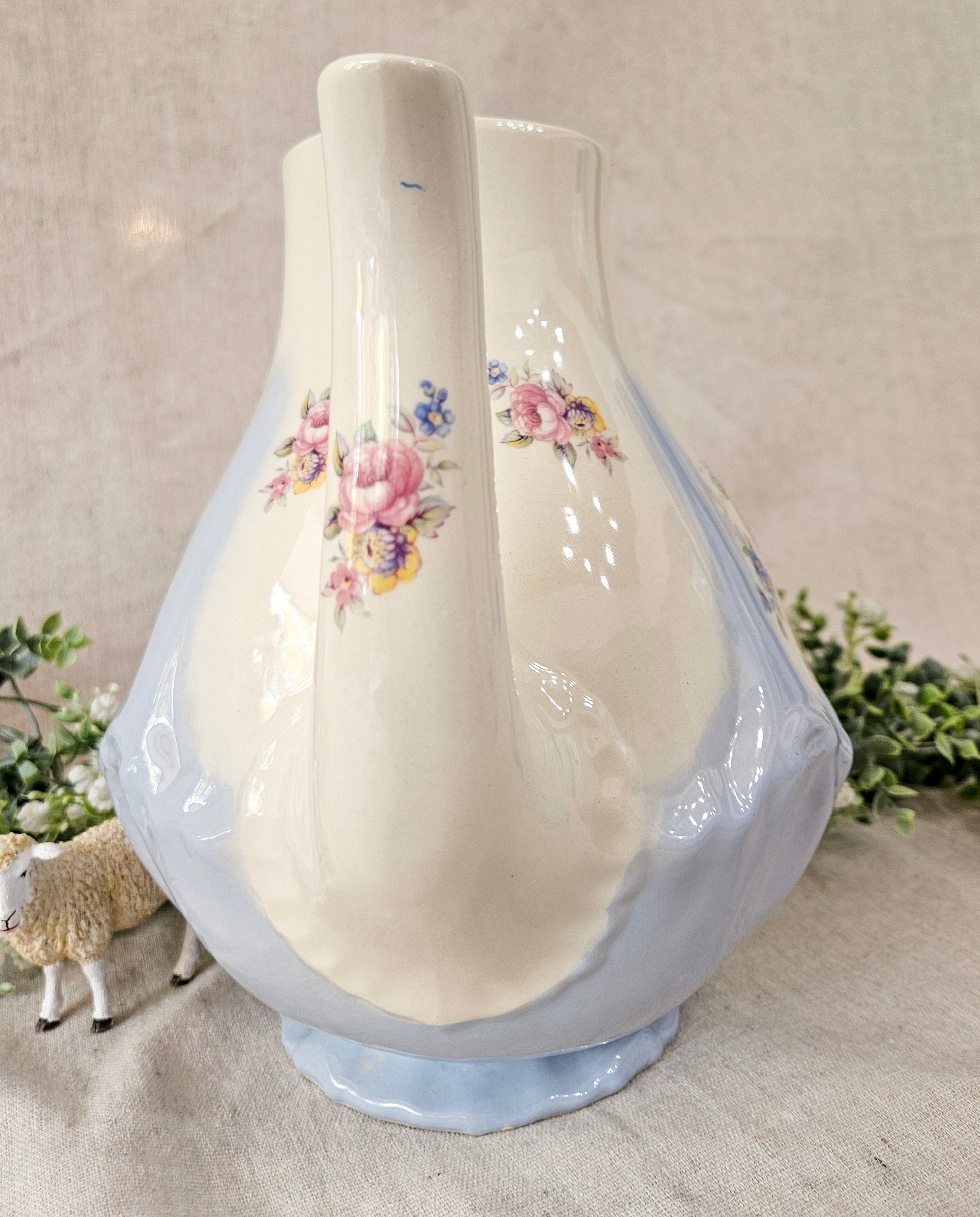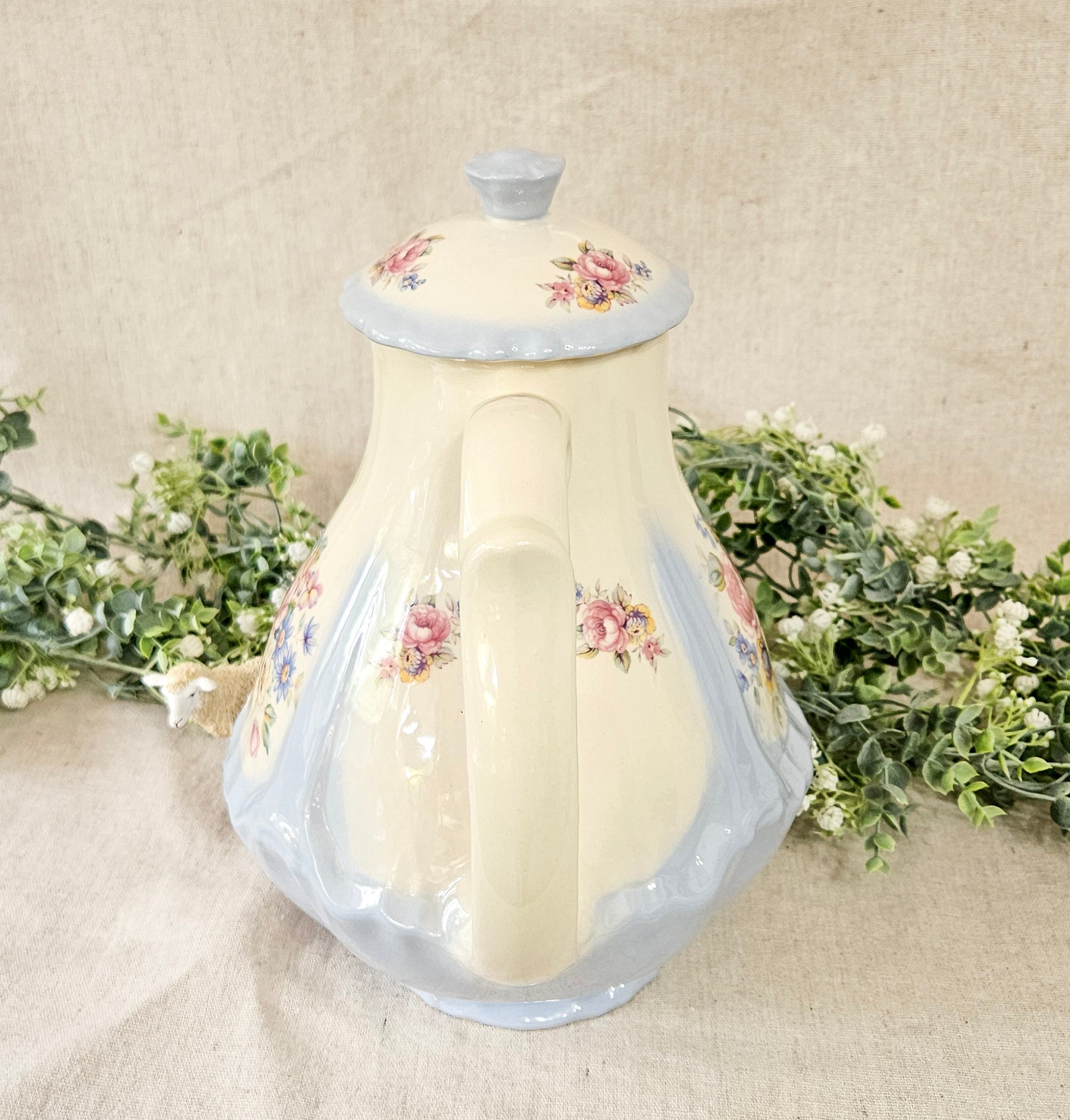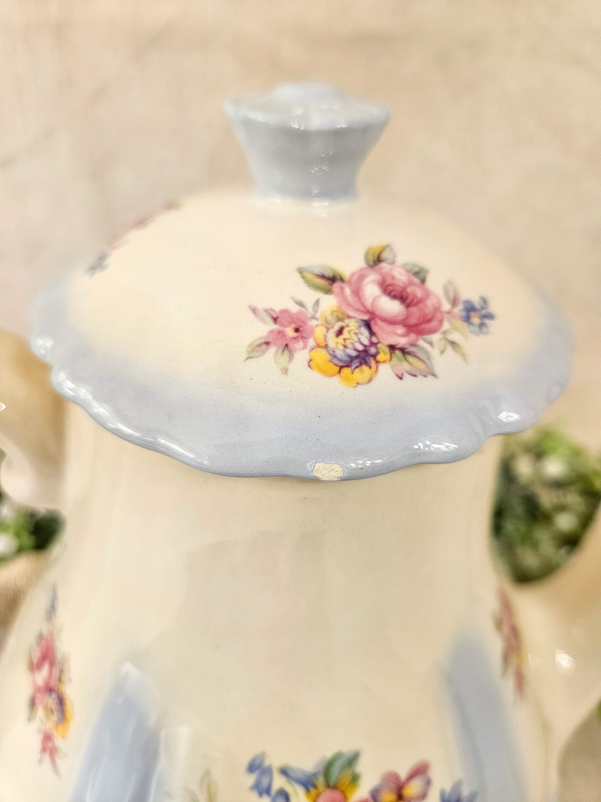 Serve coffee or hot chocolate in this delicate powder blue floral pot and impress your guests. This beauty, while vintage is in almost perfect condition, if it were not for a very small chip on the lid. There is also a small blue paint mark on the spout that appears to have happened when manufactured.