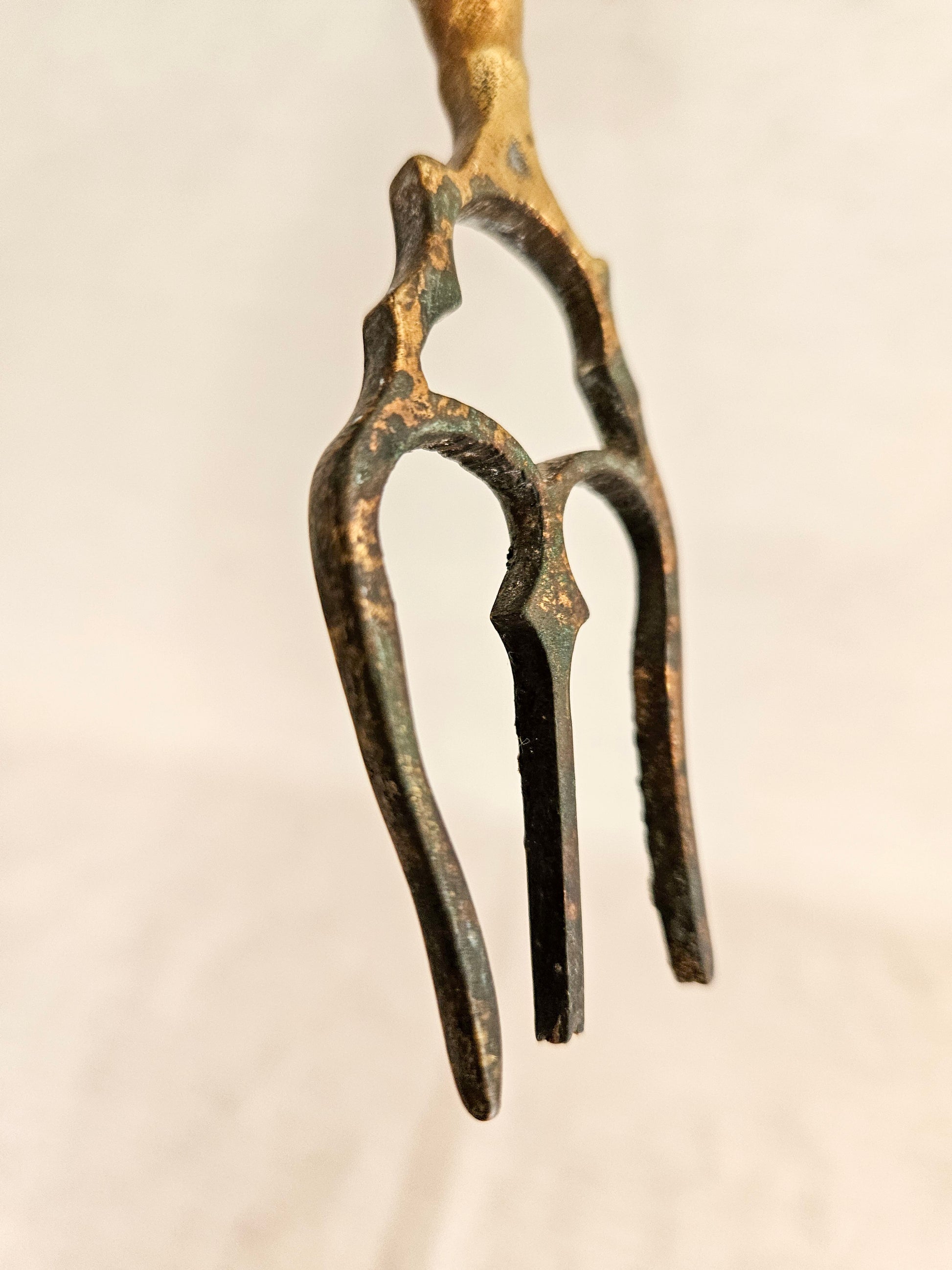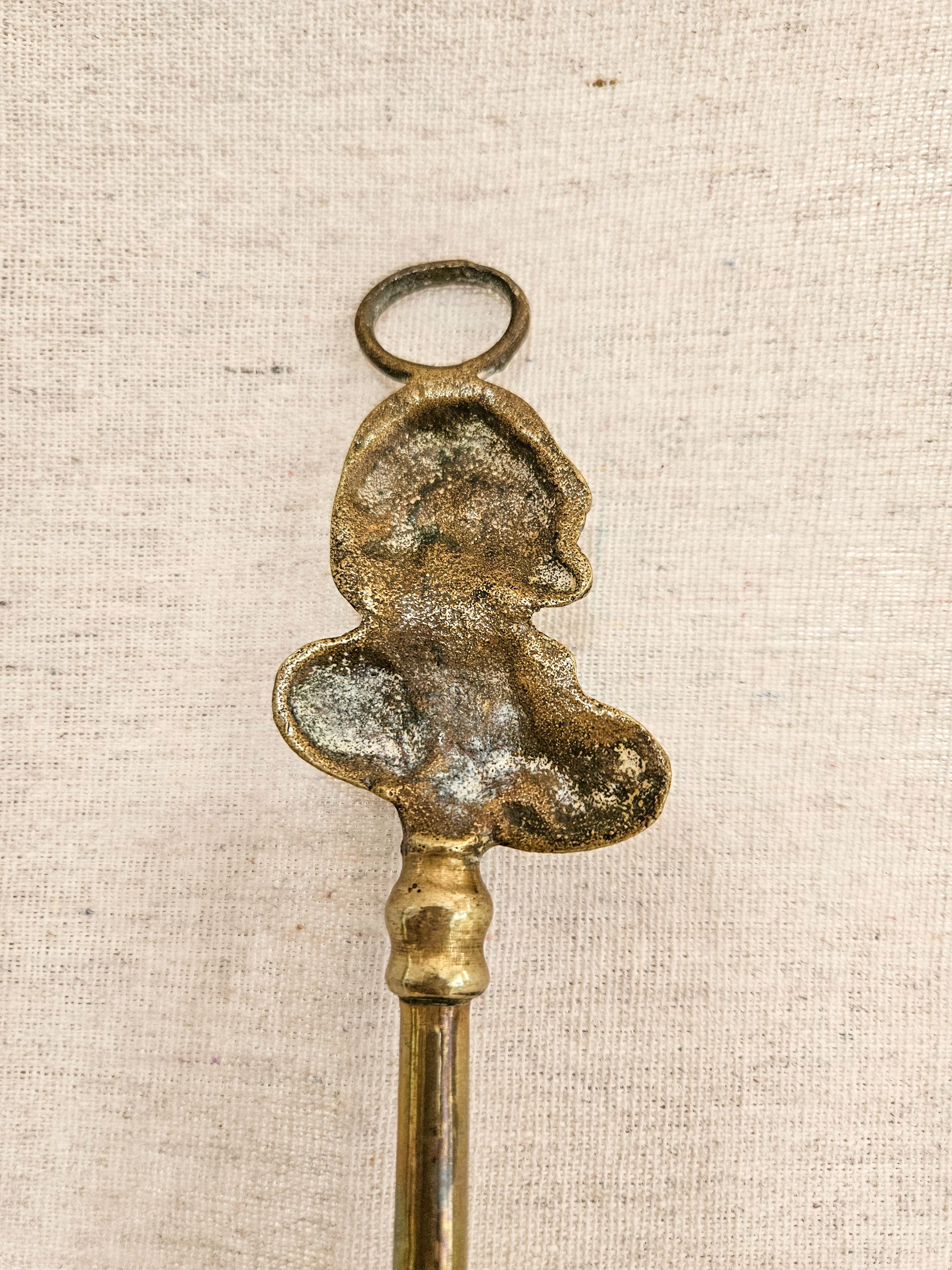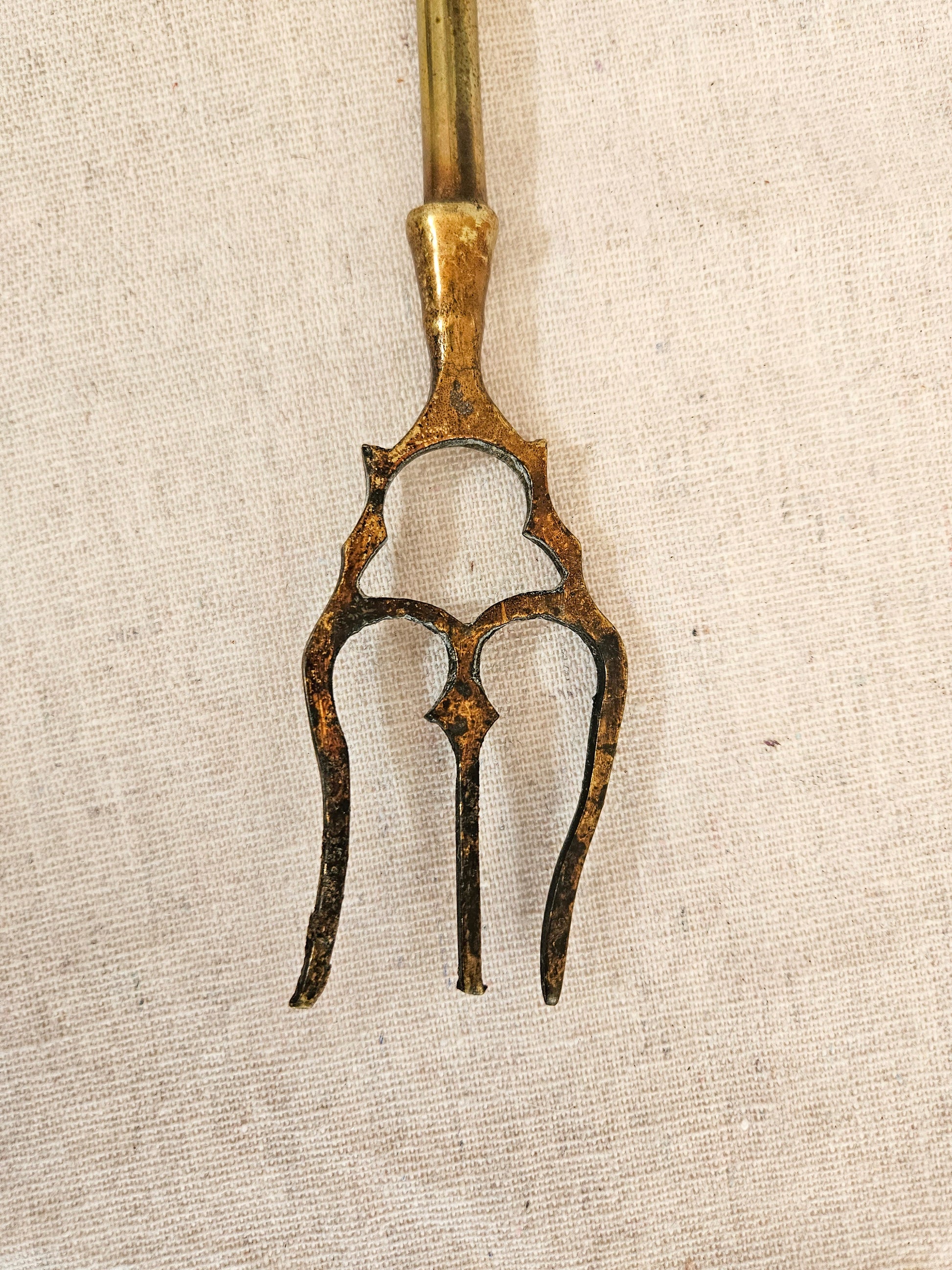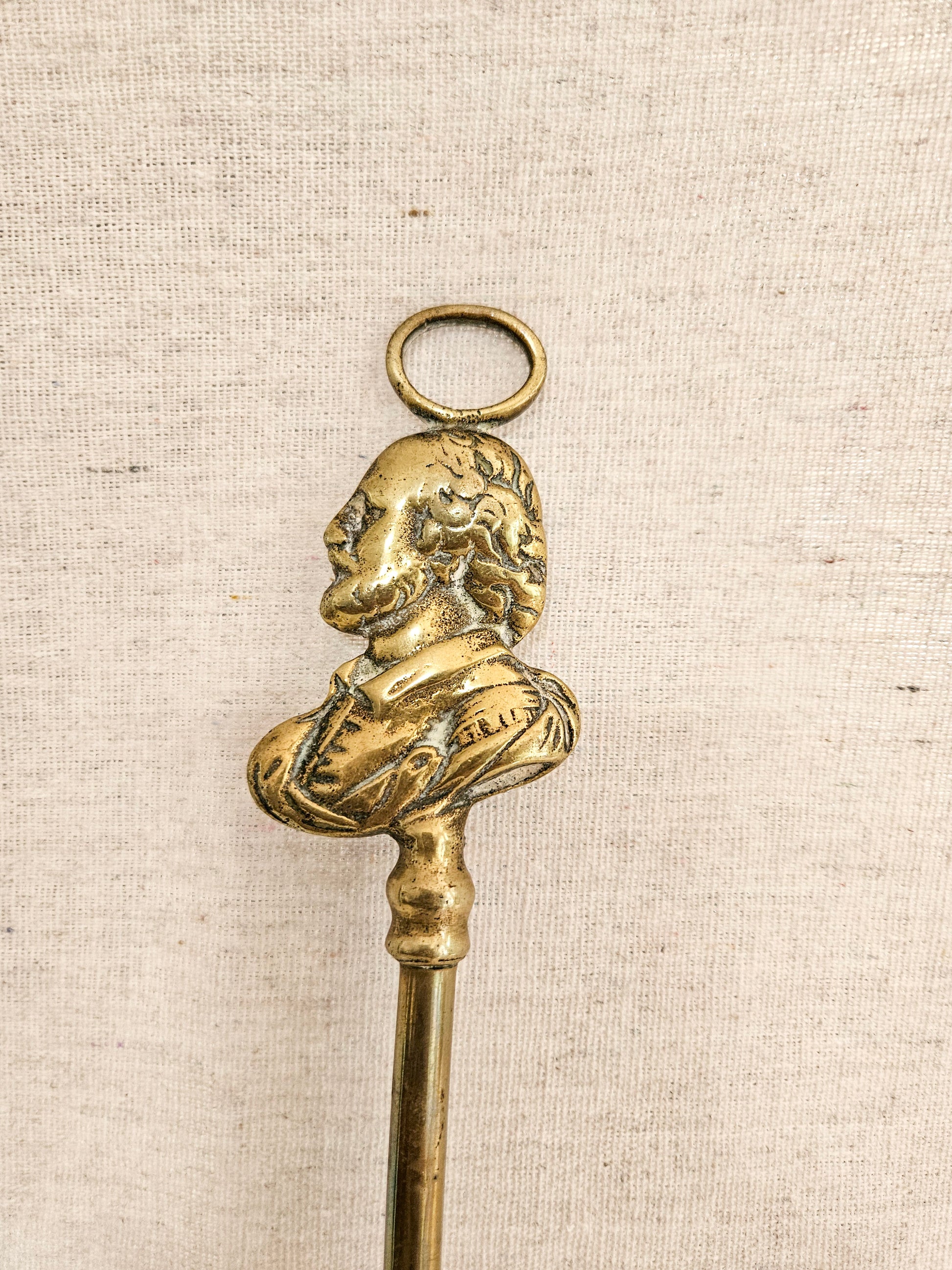 Available is a brass toasting fork with a William Shakespeare molded handle. This toasting for has visible signs of age and use, especially at the fork. Likely made in the 1930s.